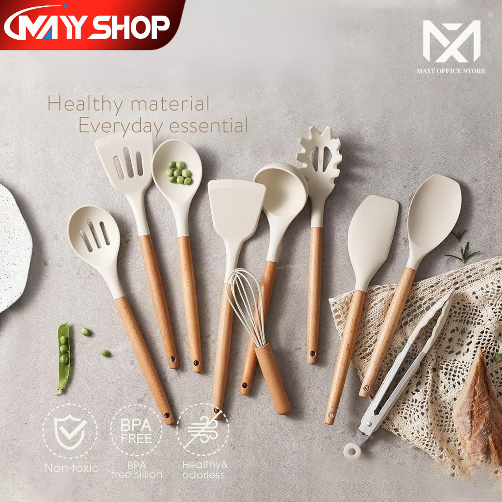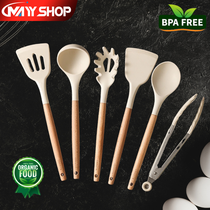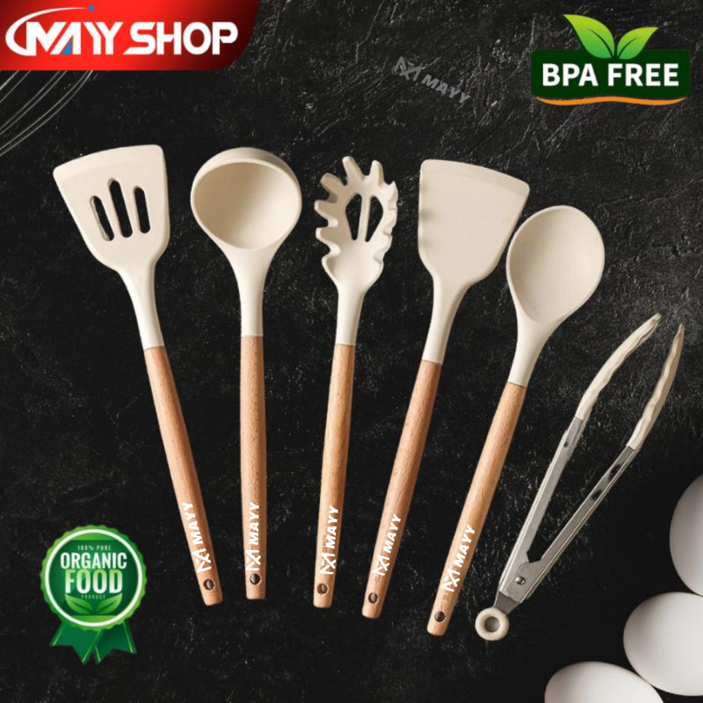 Mayy official id 6 Pcs Wooden Handle Slotted White color Non-stick Food Grade Silicone Kitchen Utensils