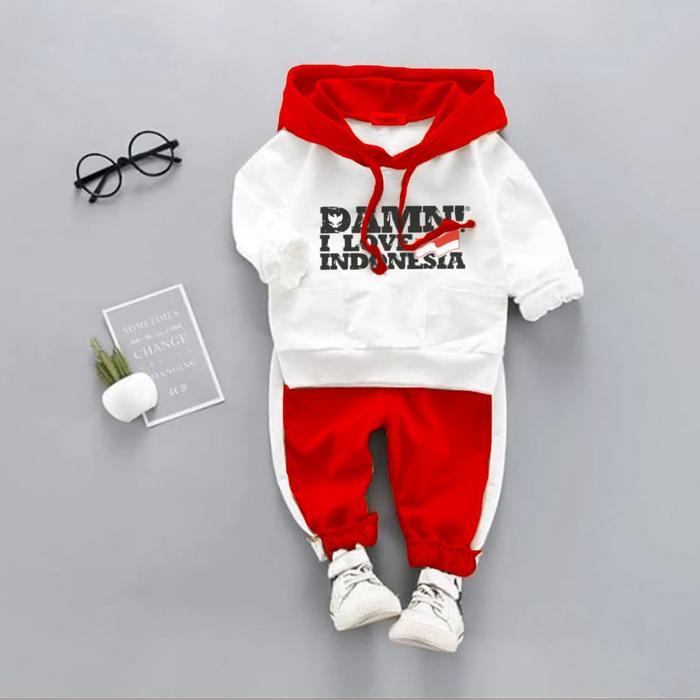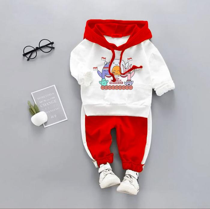 SETELAN ANAK MERAH PUTIH MOTIF KEMERDEKAAN SET HOODIE CELANA JOGER FASHION - PUTIH MERAH DAMN, 3-4 TAHUN