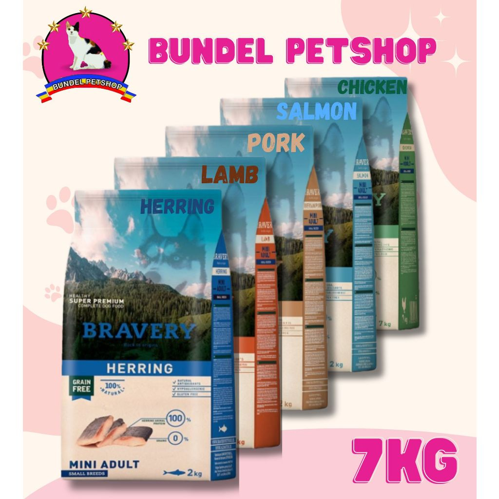 BRAVERY MINI ADULT 7Kg Small Breed - Makanan Anjing Rasa Salmon Chicken Pork Lamb Herring / Dewasa Kering Umur 12 Bulan