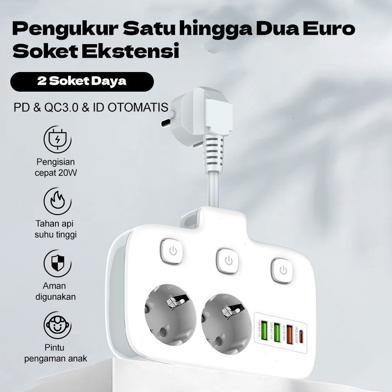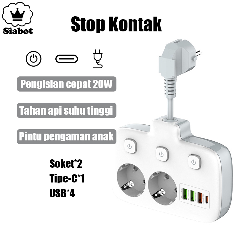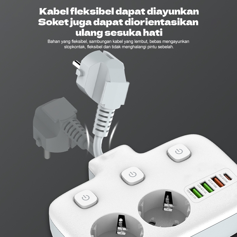 2500W Stop Kontak Colokan Multiguna Kabel Power Socket Power Socket 2 Socket 3USB 1Tipe-C Port Adaptor Steker