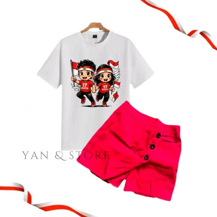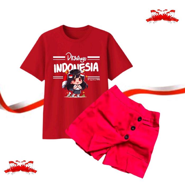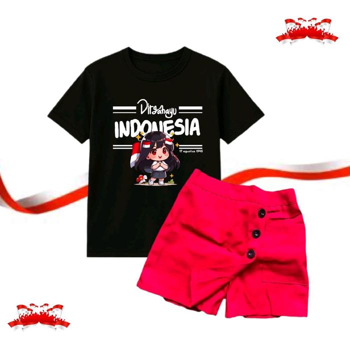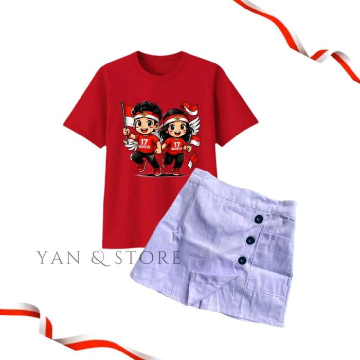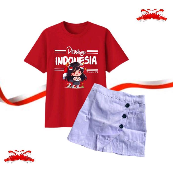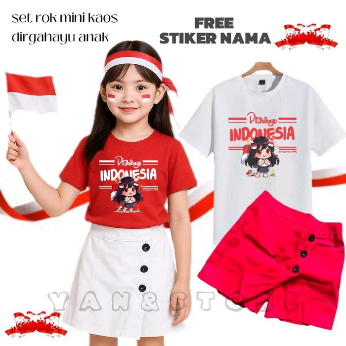 ( FREE STIKER NAMA )SETELAN ROK CELANA KAOS MERAH PUTIH EDISI KEMERDEKAAN ANAK PEREMPUAN 1-13 TAHUN AMERICAN DRILL TEBAL
