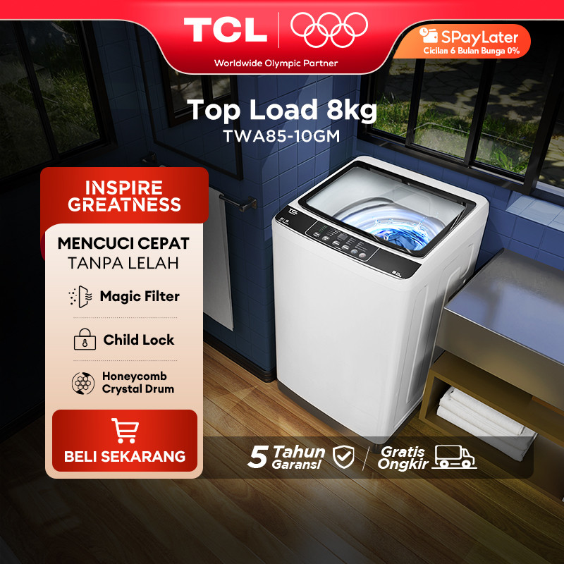 TCL Mesin Cuci 1 Tabung - Top Loading 8 KG - Honeycomb Crystal Drum - Auto Cleaning - Eight Wash Program - Dual Detergent Case (Model: TWA85-20GM)