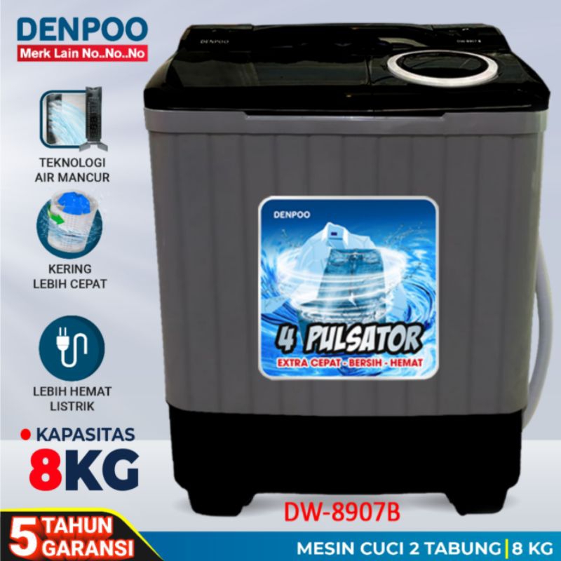 Mesin Cuci Denpoo SNI Super Hemat Listrik ( DW 8907B-4P) HITAM (8KG)2Tabung AIR PANCUR
