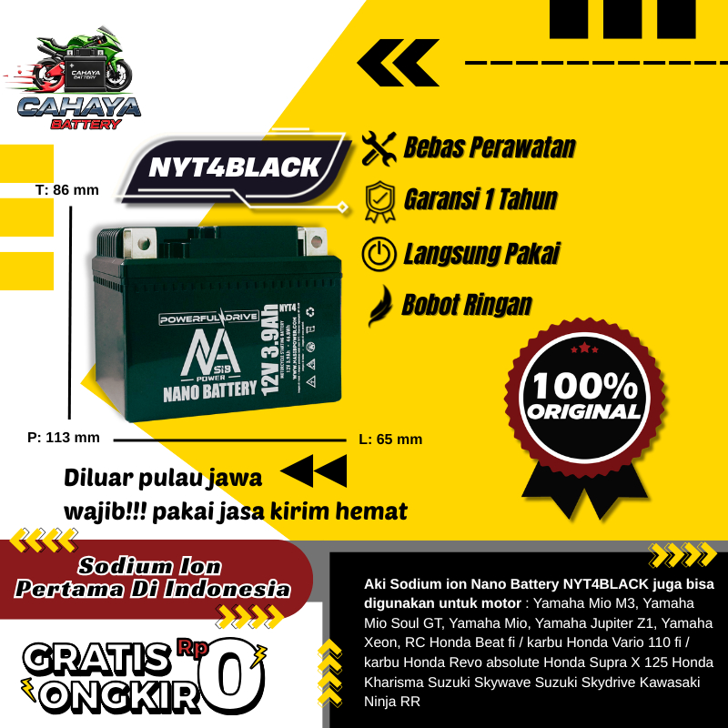 DP 0 NANO BATTERY Aki Motor Sodium Ion 12.4V 3.9Ah Aki Motor YTX4A Pengganti GTZ5S/GTZ4V/YTZ4V Aki Motor Kering Baet FI