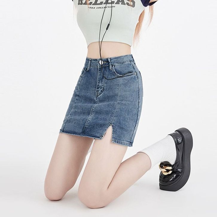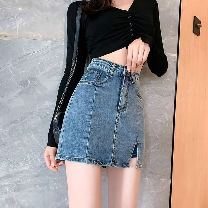 Celana Rok Denim Wanita Pendek Jeans Denim Belah Depan Ala Korea