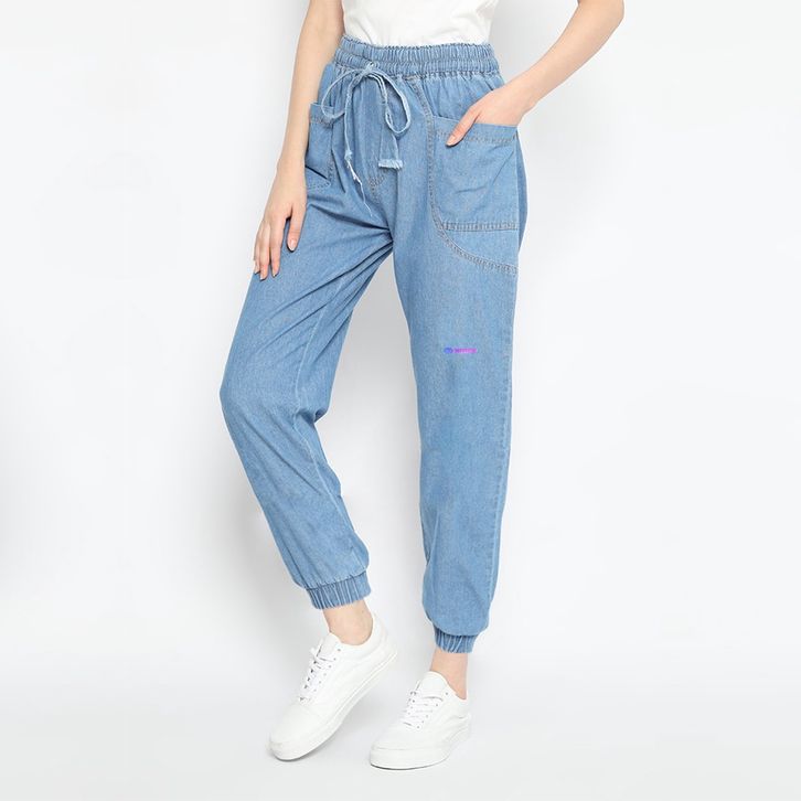 Celana Jeans Denim Panjang Jogger Highwaist Jeans Pinggang Karet Wisteria All Warna Blue Cream Biru Krim Navy Hitam Snow