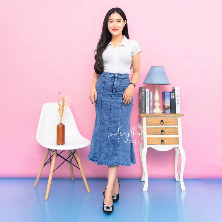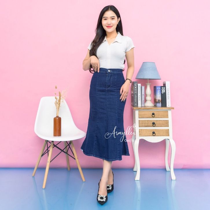 Rok Jeans Mermaid Midi Skirt Duyung Highwaist Rok Span Jeans Wanita Casual Jeans Stretch Mulur Muat Bb Jumbo