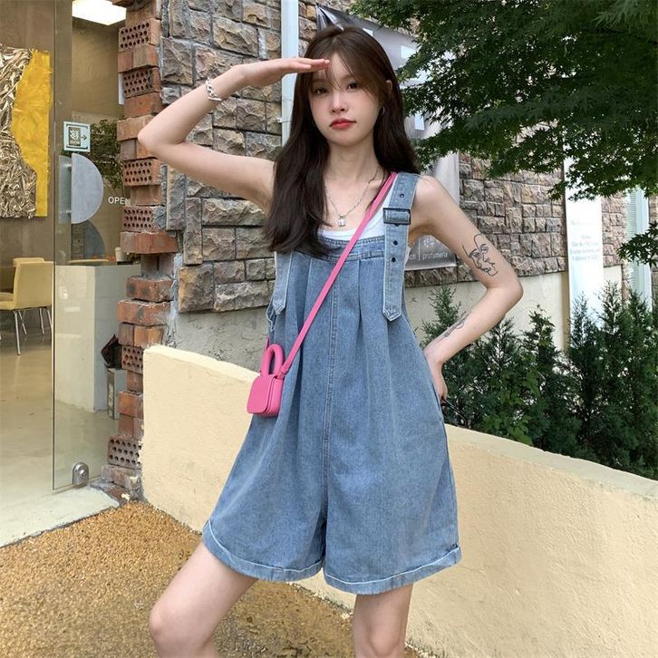 Baju Kodok Jumpsuit Denim Jeans Cewek Celana Pendek Jumpsuit Wanita Korea Style Celana Cute Celana Longgar Lebar Kaki