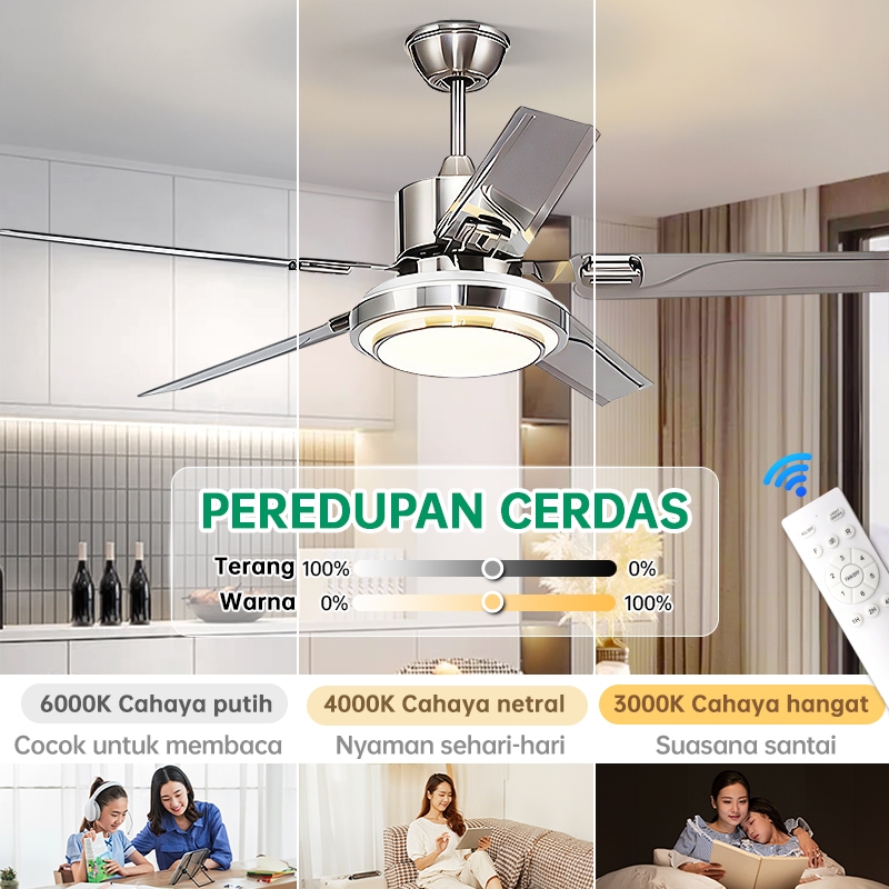 GOGEOUS Lampu kipas angin plafon LED 2in1 3 warna 6 kecepatan 42/48/52 inci kipas angin gantung plafon dengan lampu meja makan kamar tidur balkon lampu kipas angin plafon remote
