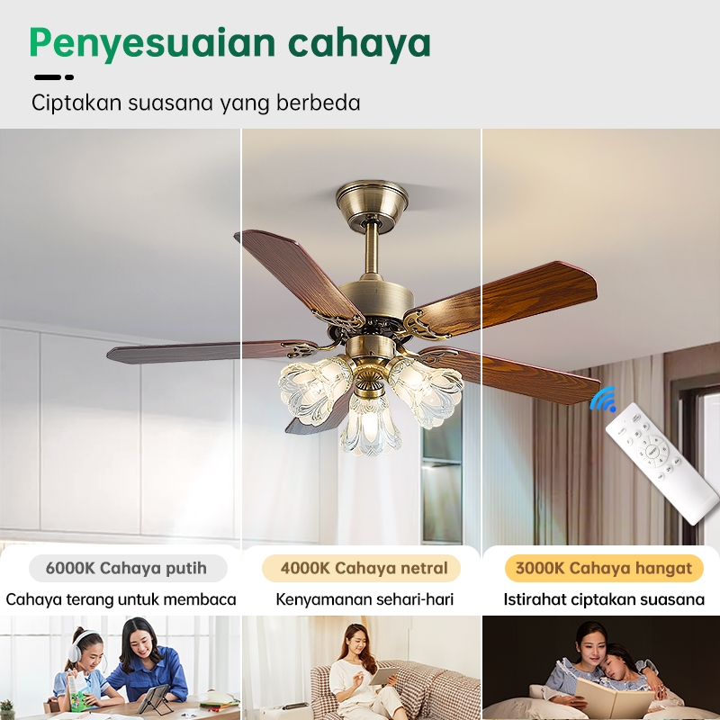 Gogeous Lampu kipas kendali jarak jauh 2-in-1 Gaya retro 42/48 inci lampu gantung ruang tamu mewah 3 warna lampu kipas led ruang tamu/meja makan/balkon remote