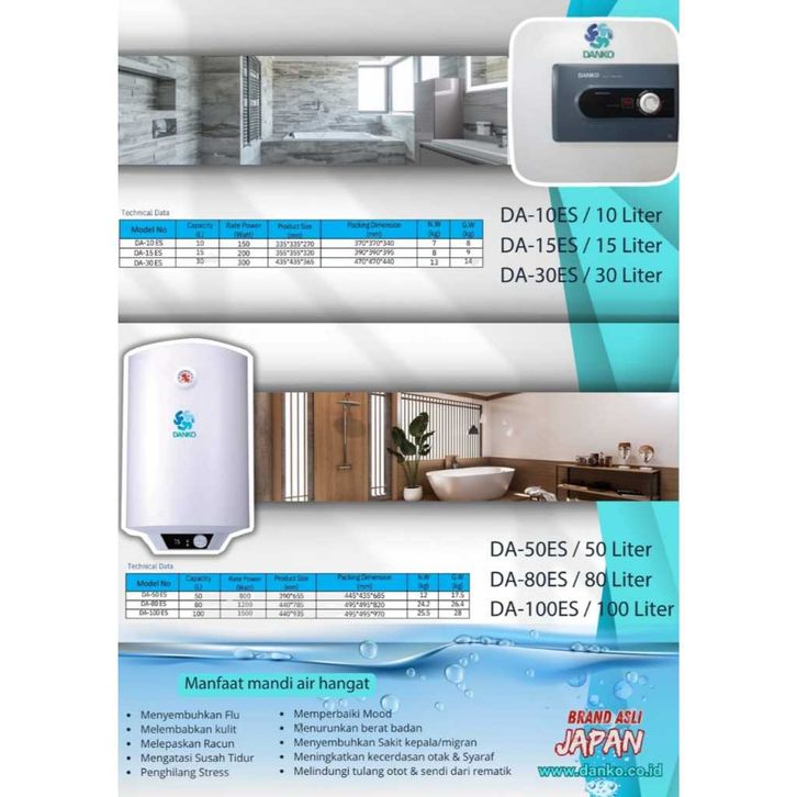 Water Heater DANKO JAPAN 10L 15L 30L - Pemanas Air Listrik Aman, Hemat Daya, Anti Bocor 1 Set Selang