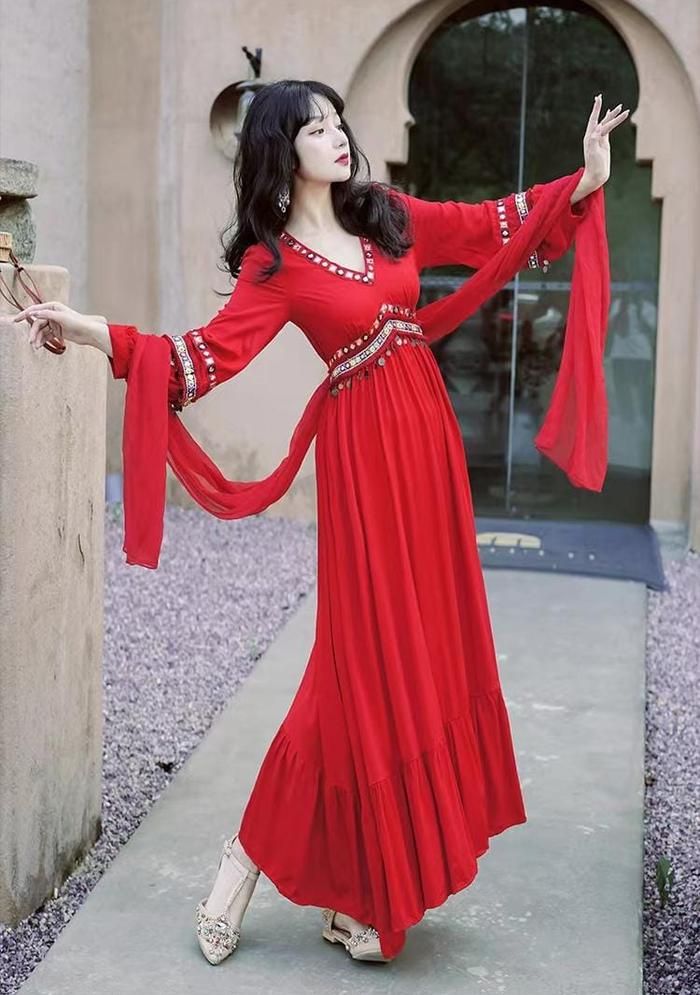 red long dress bohemian wanita + kain shawl / summer dress pantai bali