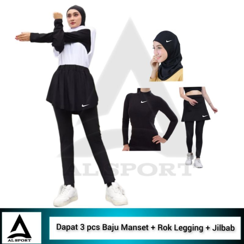 3 IN 1 - Stelan Olahraga Wanita Baju Manset Lengan Panjang Rok Legging Dan Jilbab Sport Lari Voly Senam Joging