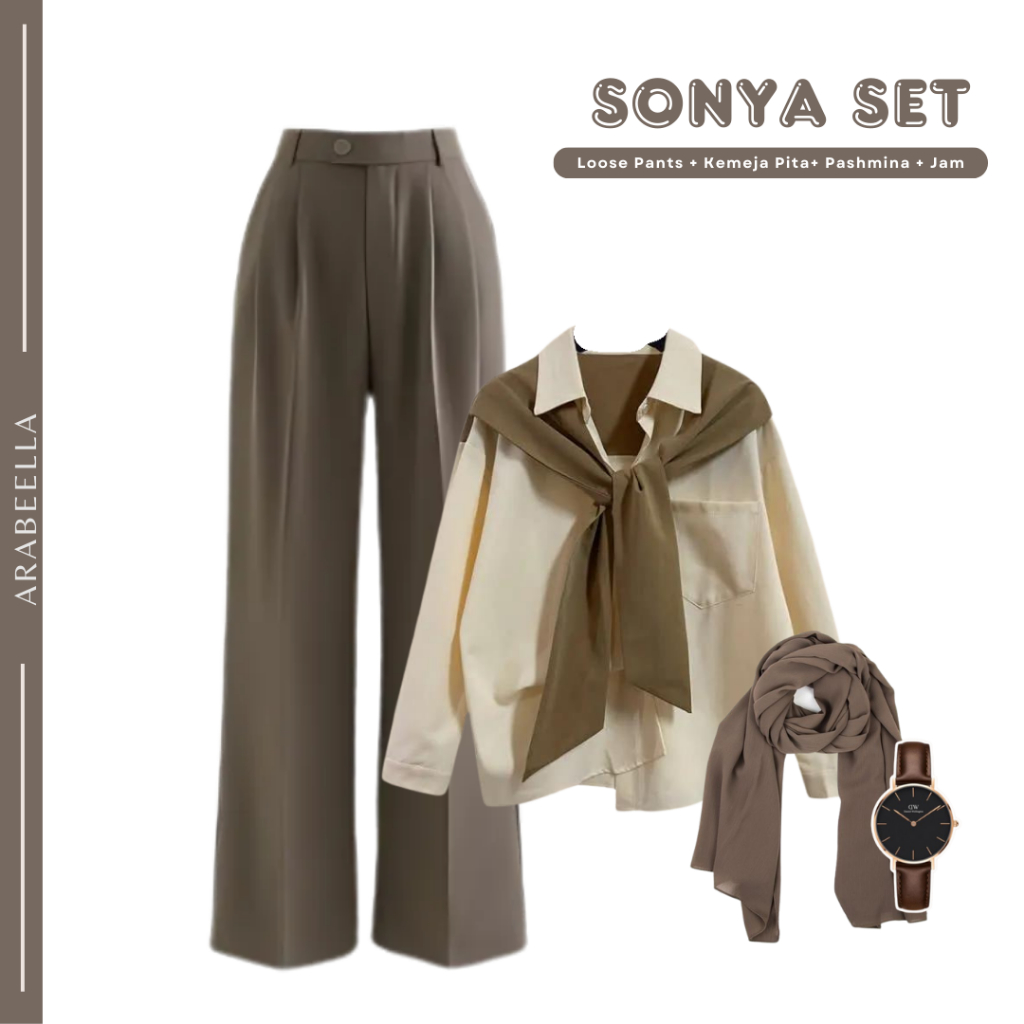 Setelan Wanita Sonya Loose Pants Kemeja Pita Pashmina Jersey Jam Tangan Oneset Cewek