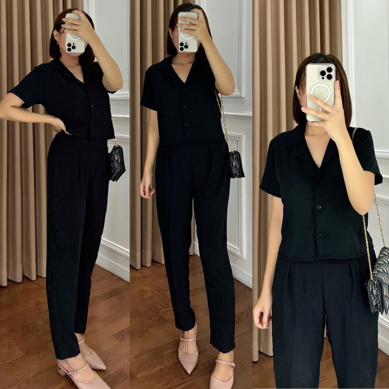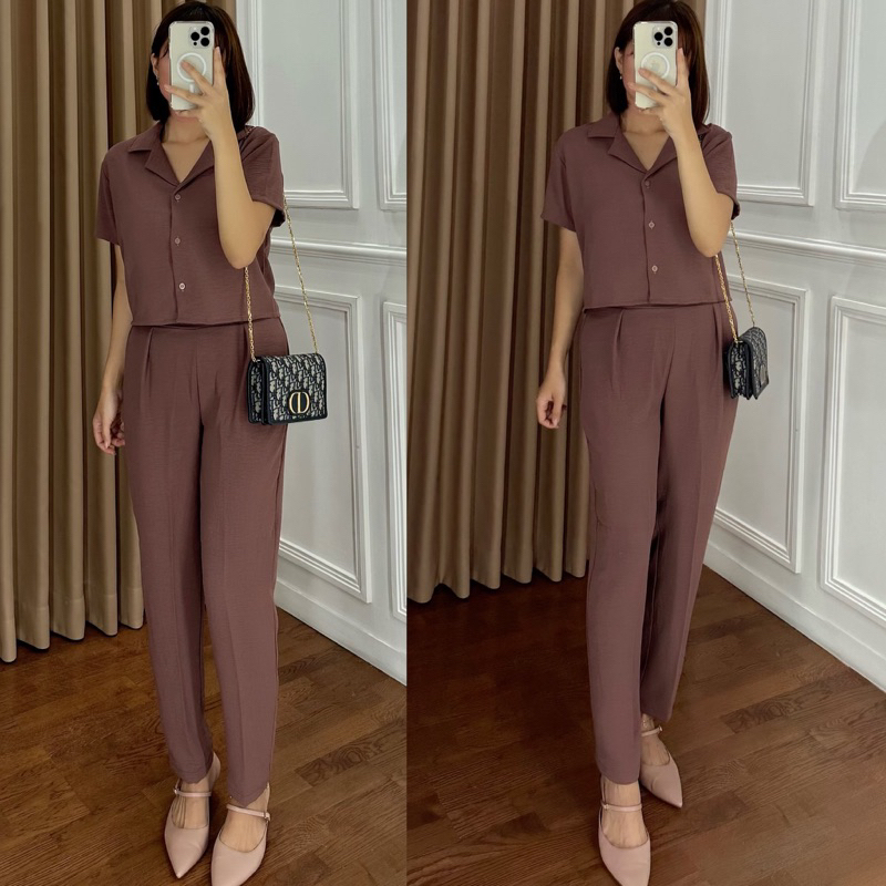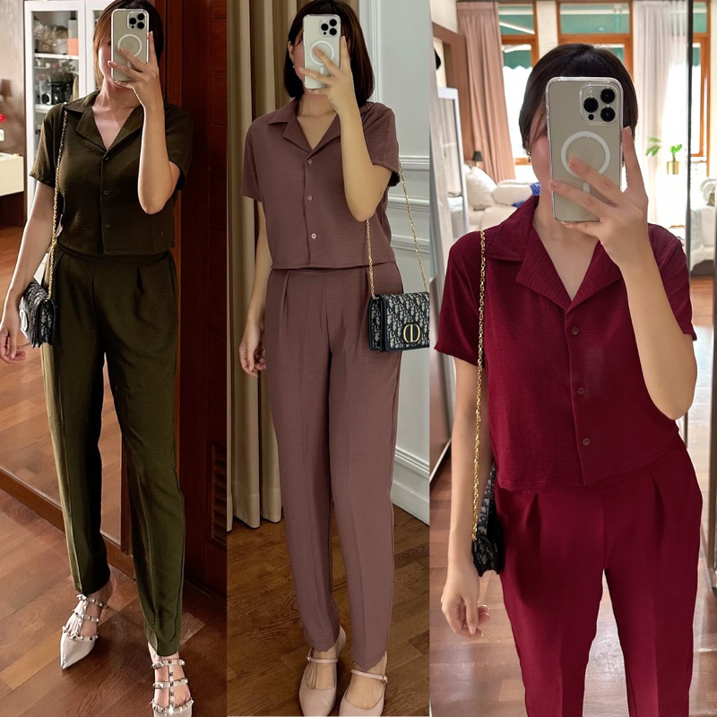 ONE SET TANGAN PENDEK CRINCLE PREMIUM SETELAN CRINKLE SETCEL PAKAIAN WANITA FULL KANCING BUSUI