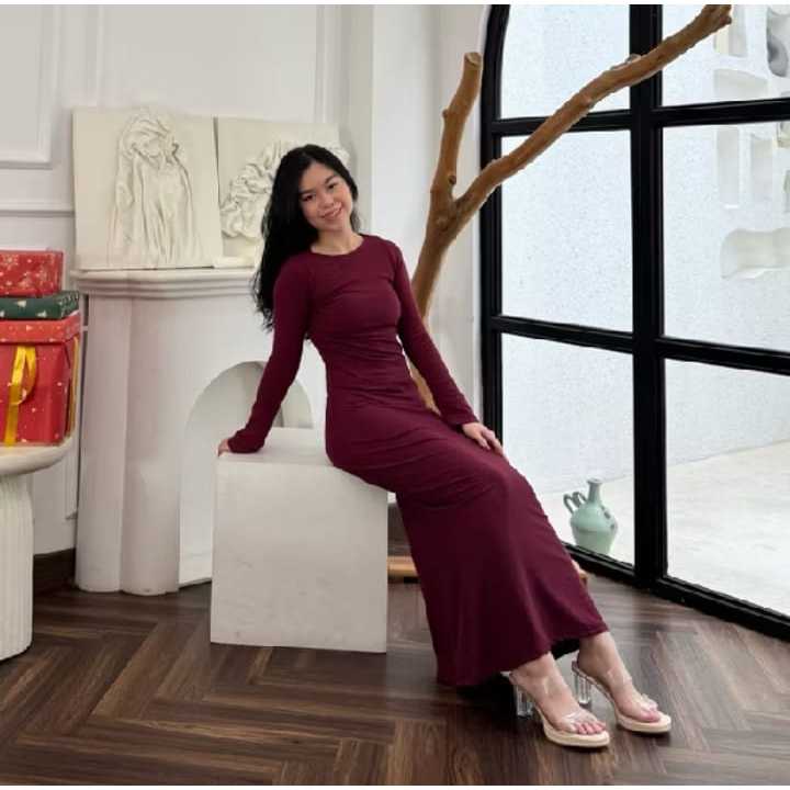 Long Dress | Slim Fit Gaun Wanita Rib Knit Casual Basic Dress rajut Press Body Korean style Bodycon