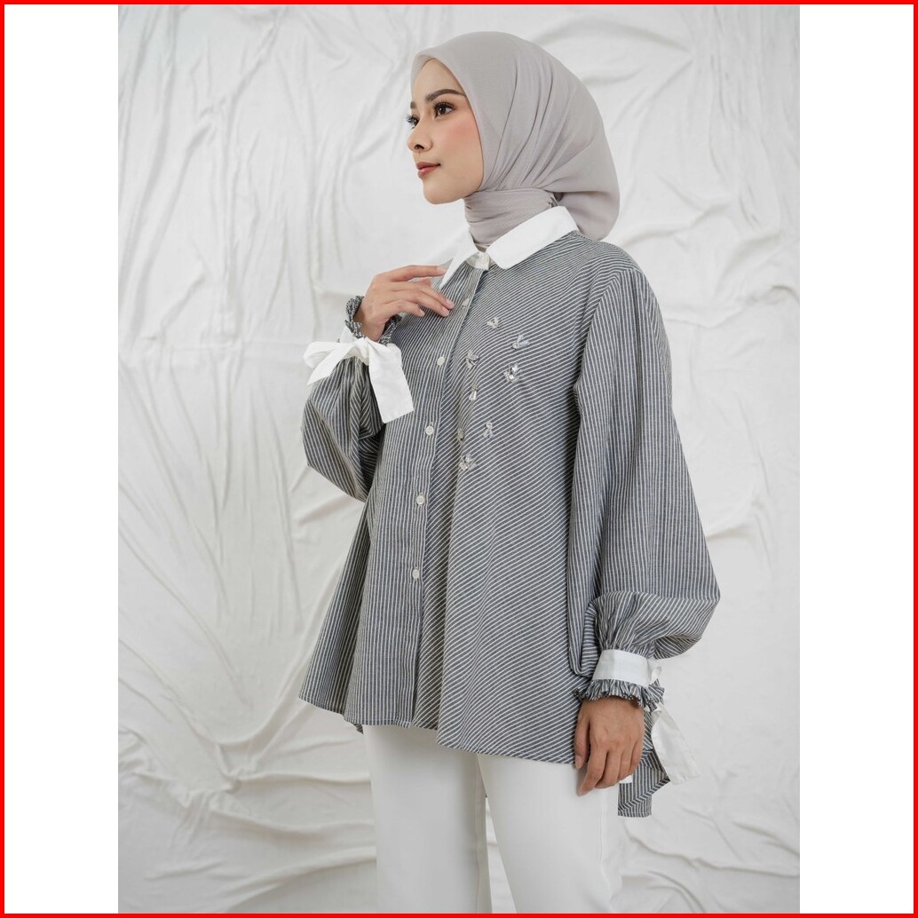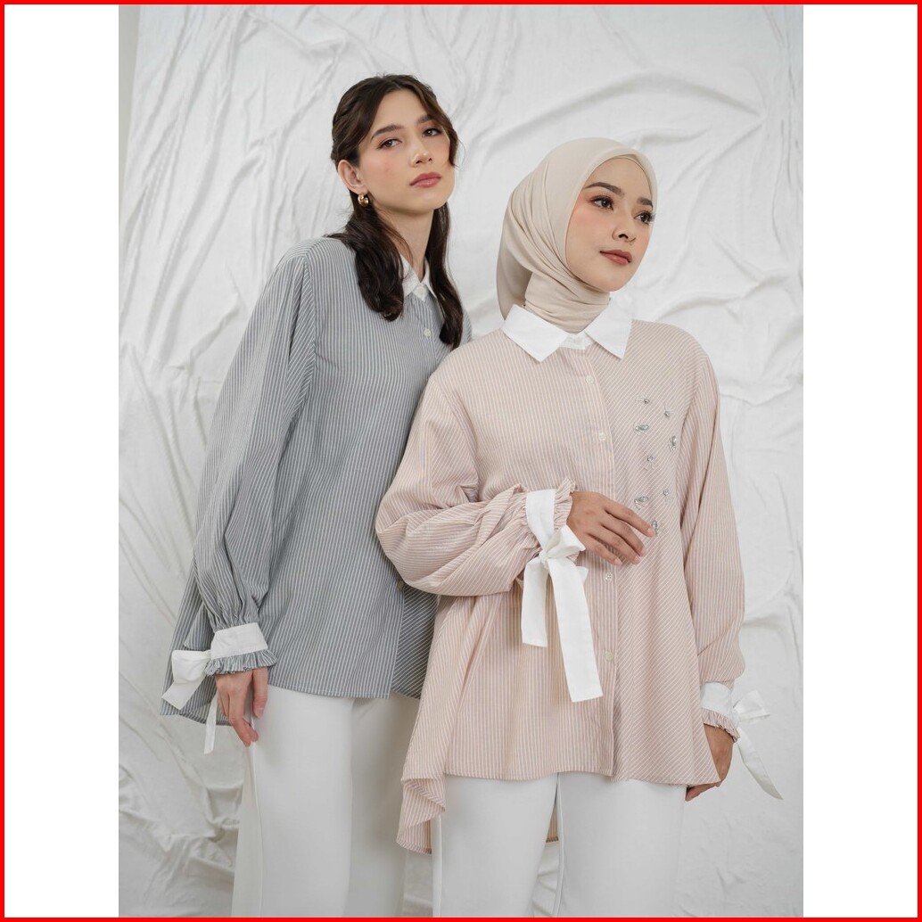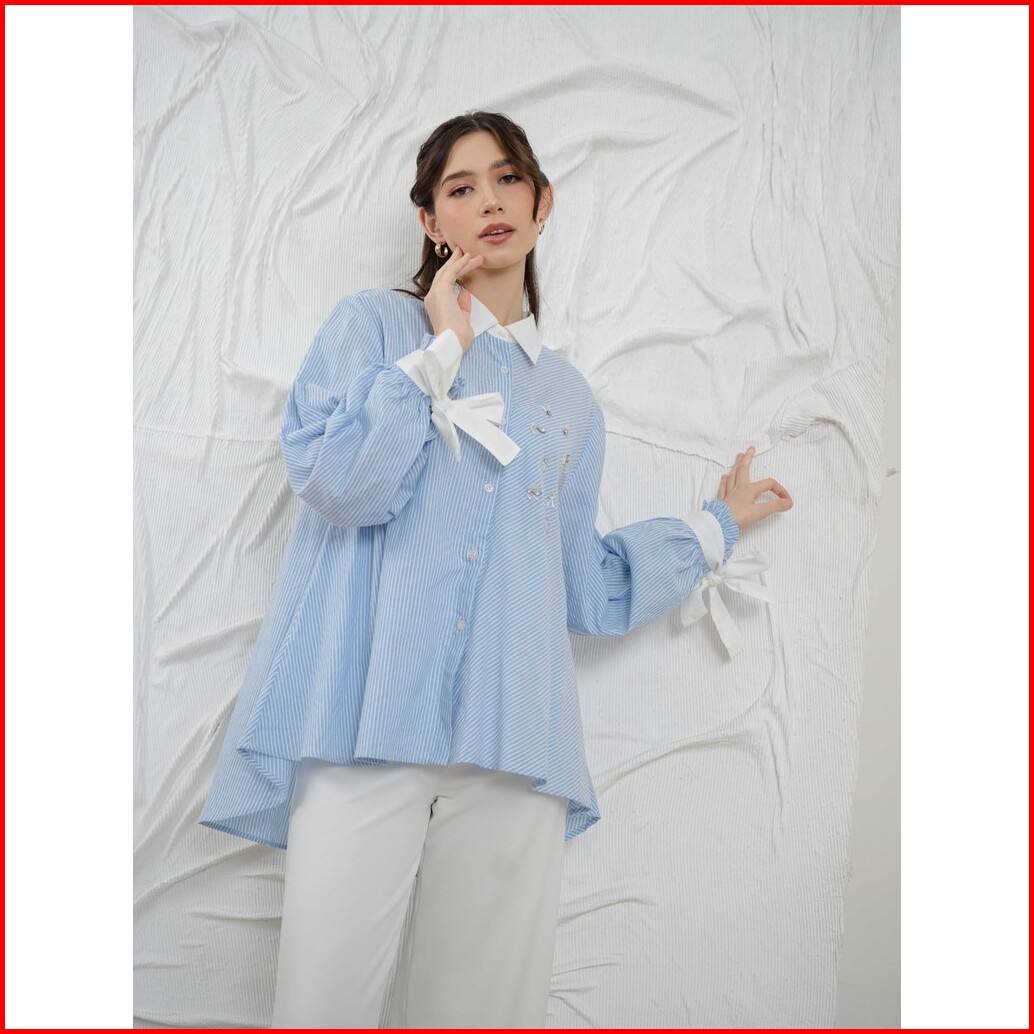 Mayoutfit Julene Shirt Kemeja Stripe Wanita Katun Garis Aksen Payet Lengan Pita