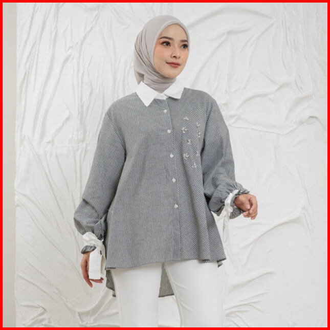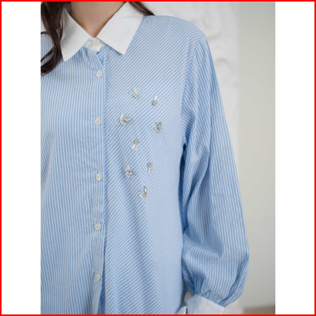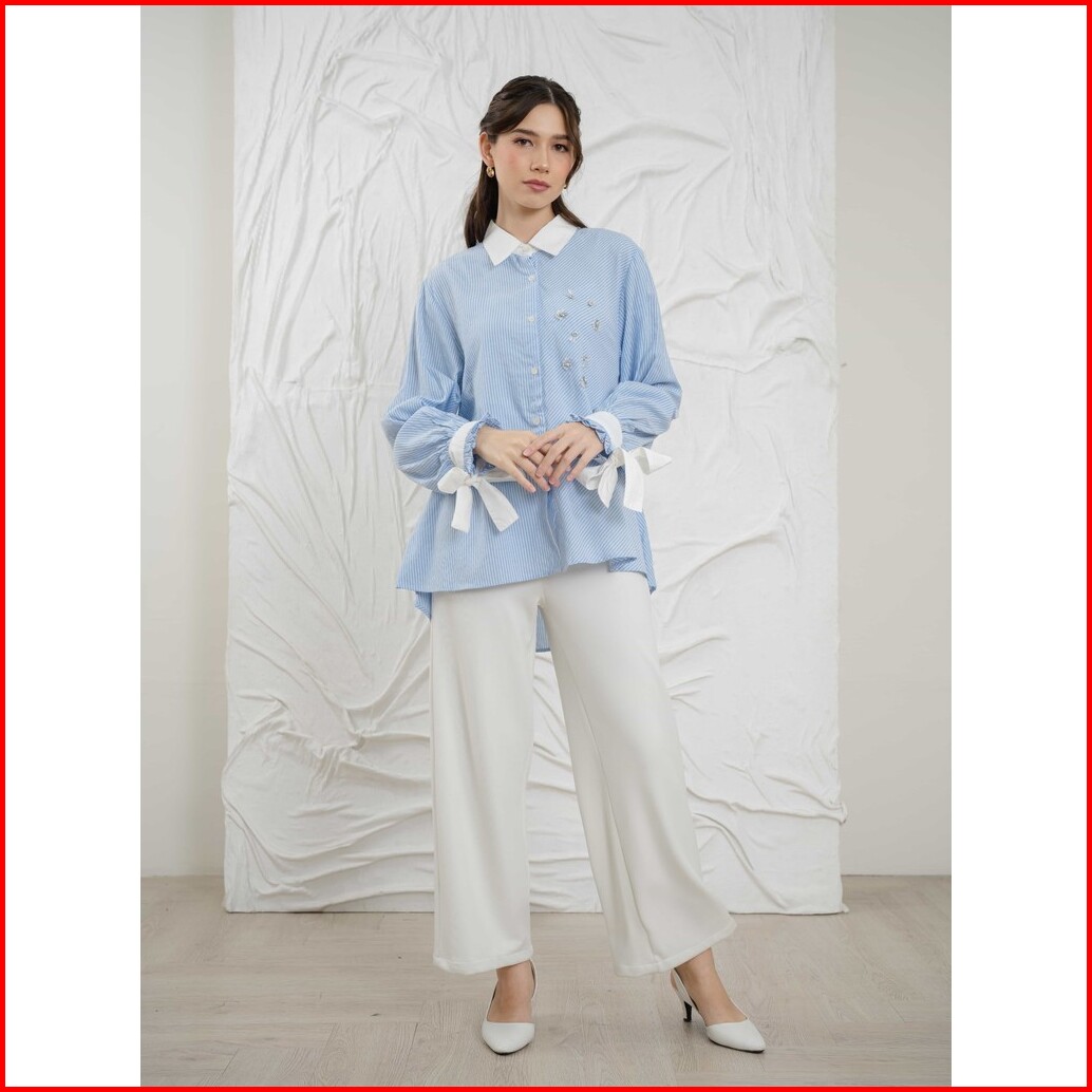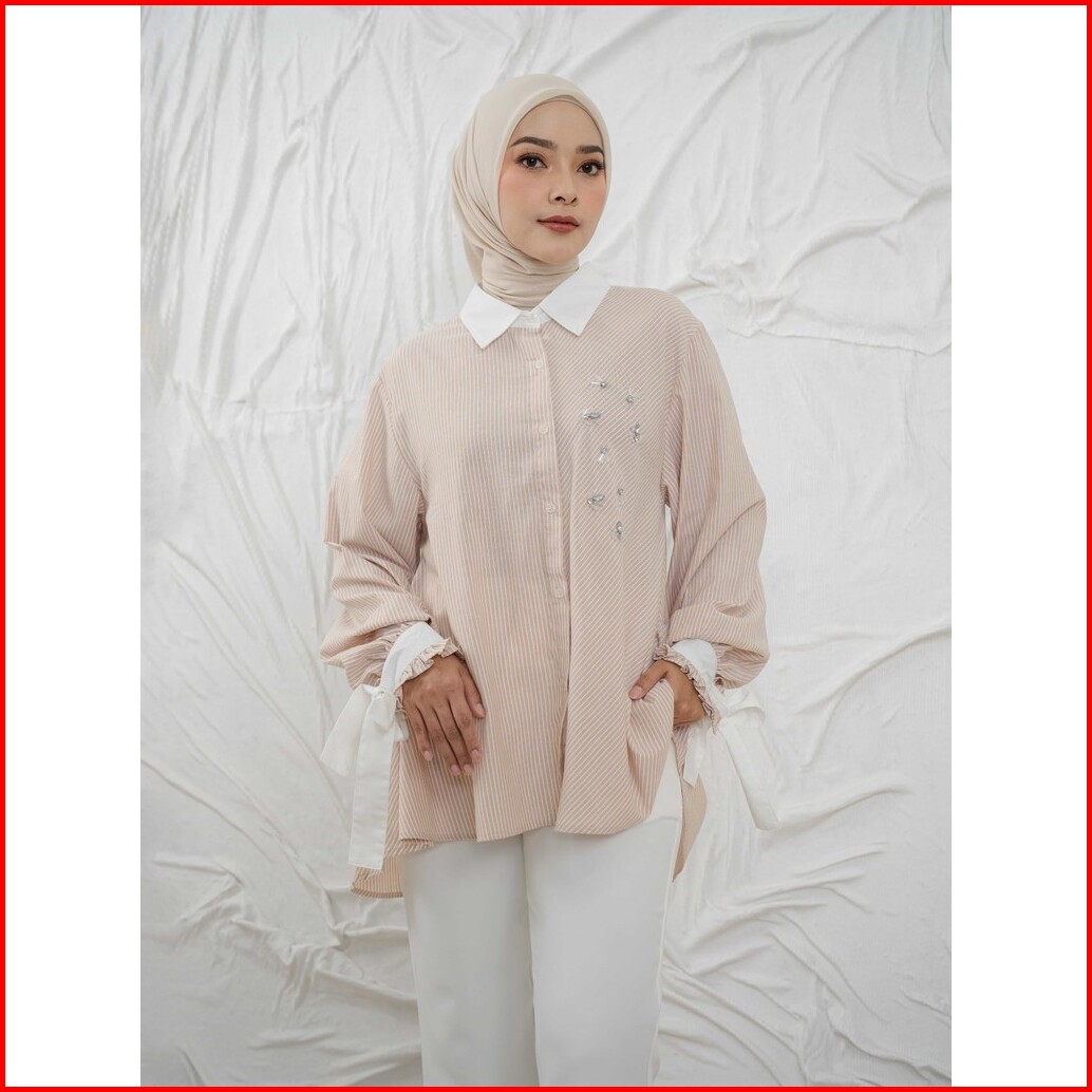 Mayoutfit Julene Shirt Kemeja Stripe Wanita Katun Garis Aksen Payet Lengan Pita