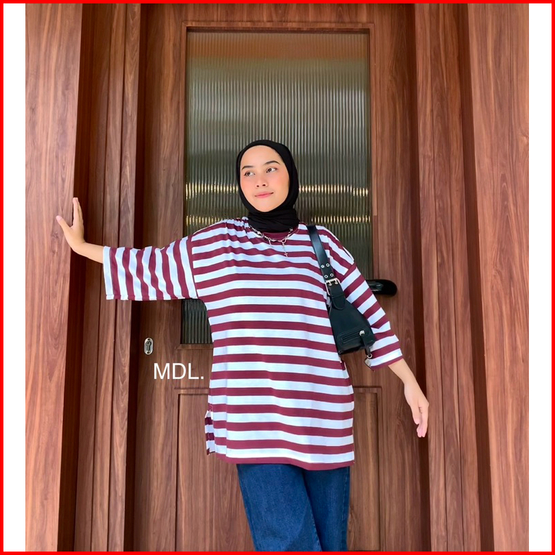 Kaos Oversize Stripy Salur Stripes Top Jumbo Xxl Basic Lengan 7 8 Cotton Combed 30s Modellano