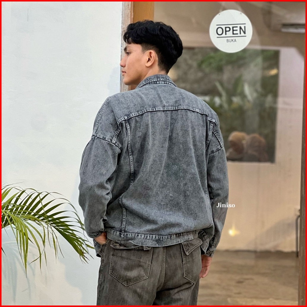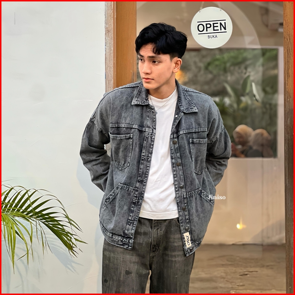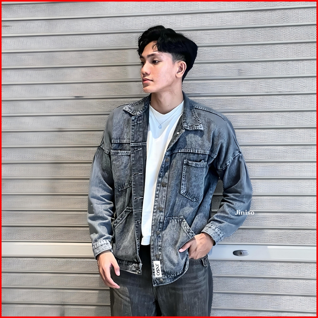 Jiniso - Denim Pria Jaket Jeans Oversize Pocket Atlas Snow Grey