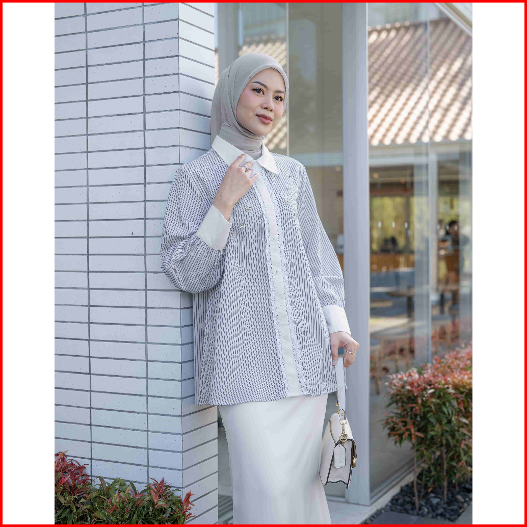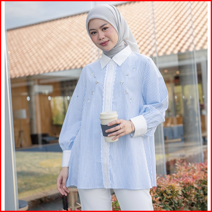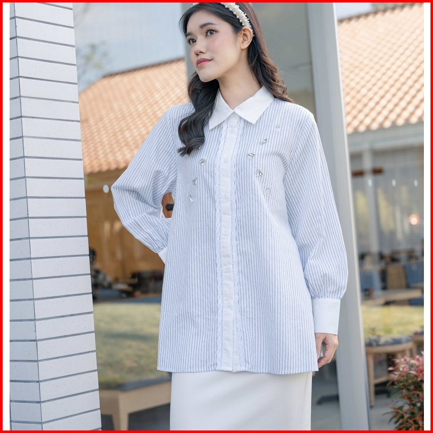 Mayoutfit Daniesha Shirt Kemeja Wanita Katun Stripe Aksen Payet Beads Kombi Renda Lace Brukat