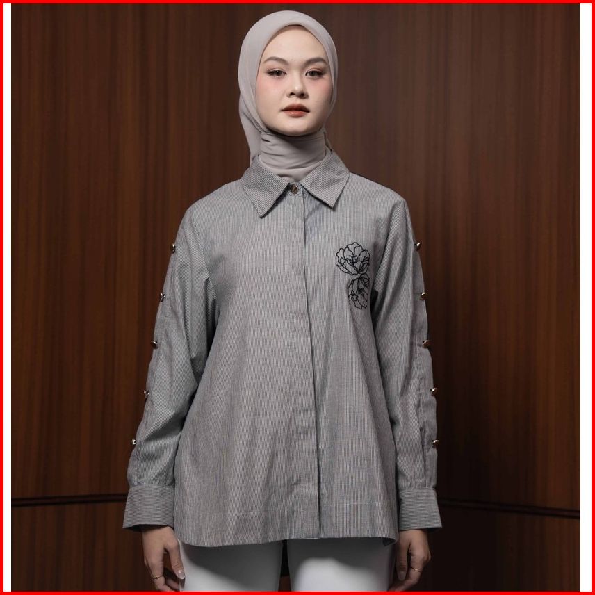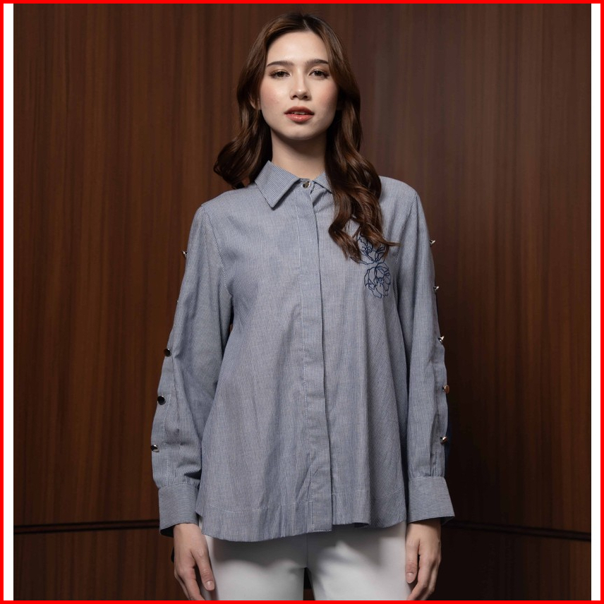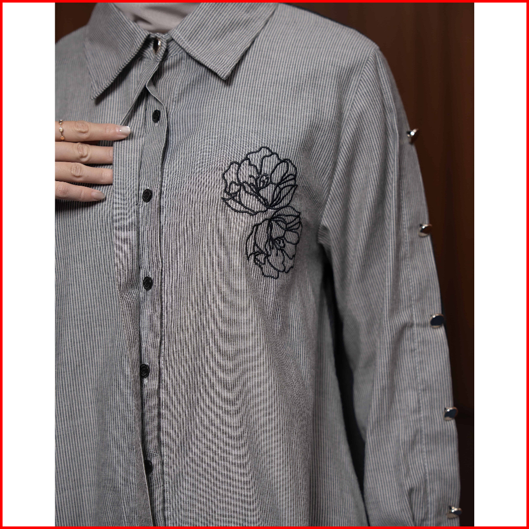 Mayoutfit Emberly Shirt Atasan Kemeja Wanita Kombi Denim Cotton Stripe Bordir Bunga Embroidery