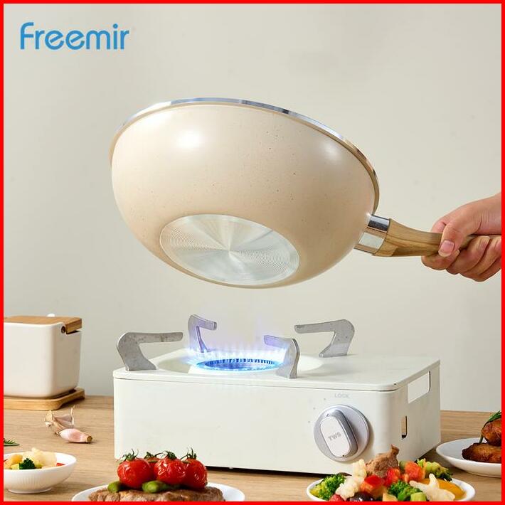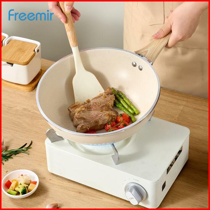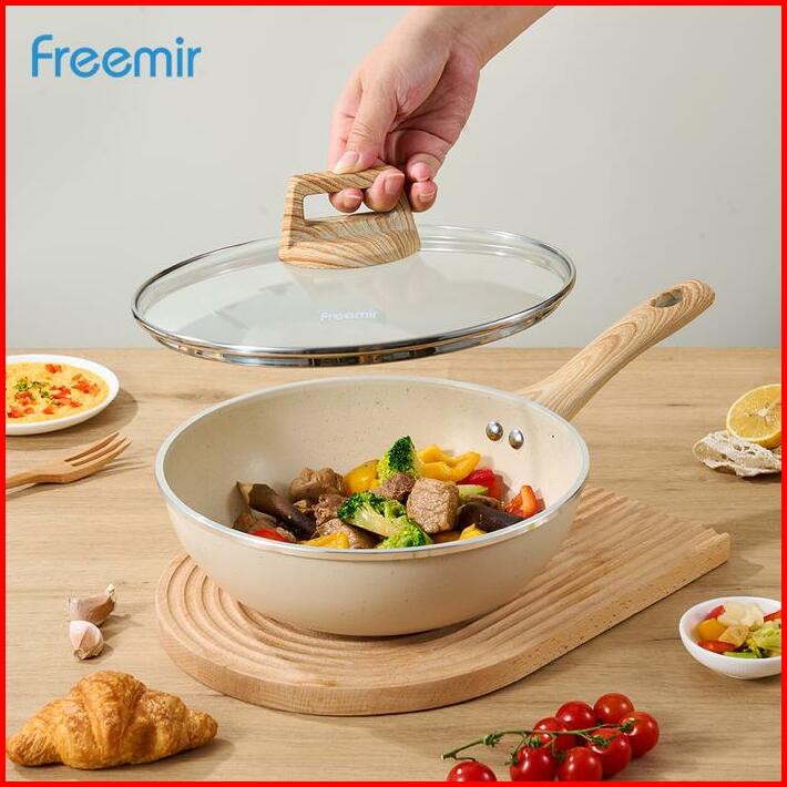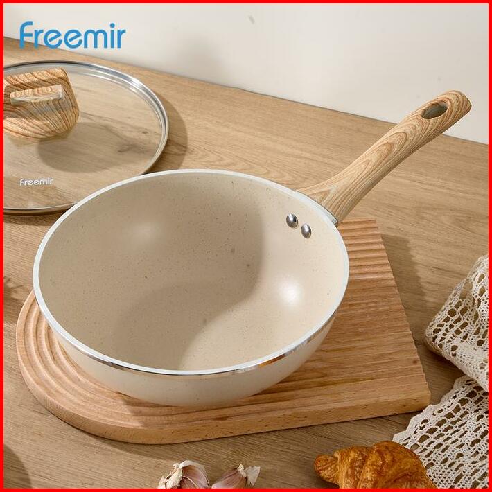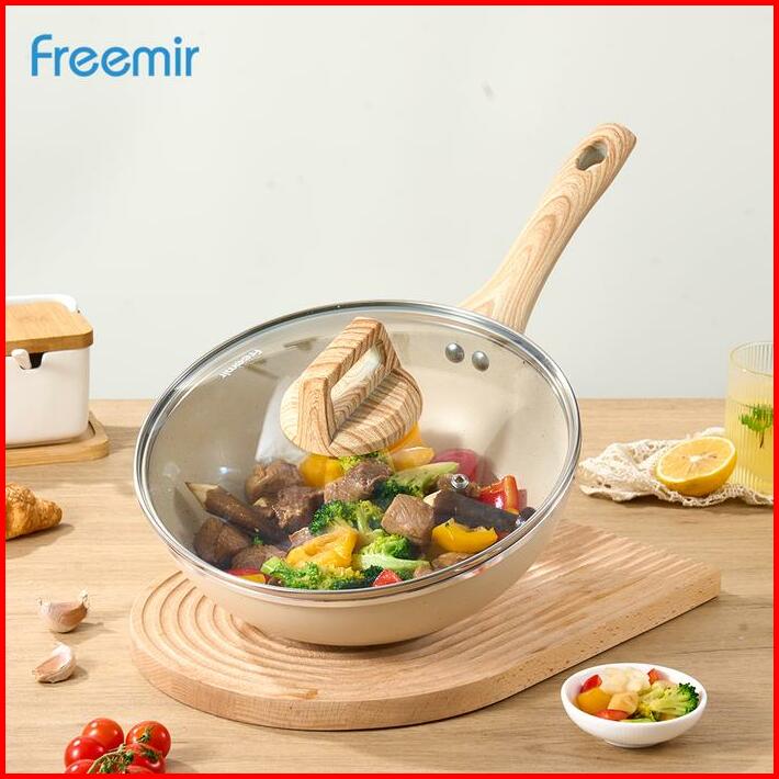 Freemir Super Wok Pan 24 Cm Beige Anti Lengket Wajan Cekung Premium Tutup Kaca Tahan Lama Kitchenware