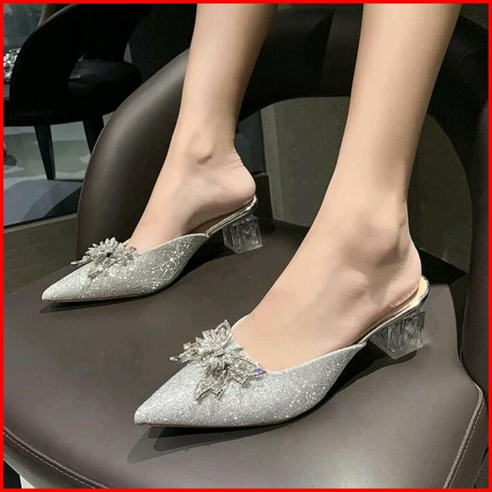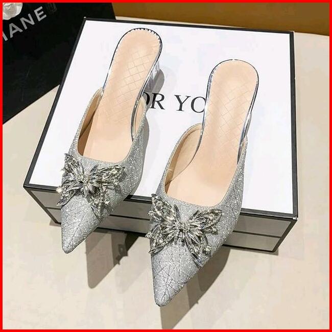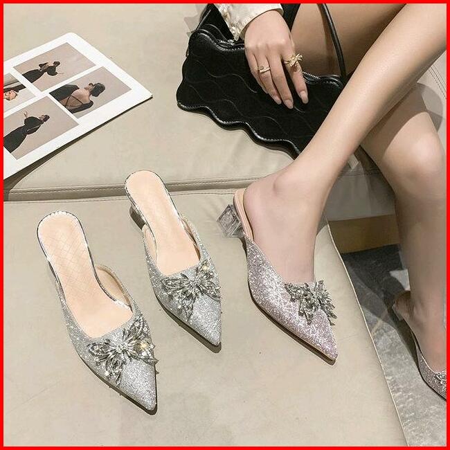 Series Ar.14 Sandal Pesta Wanita Mules Heels Elegan Hak Kaca 5cm Bruso Butterfly Square Toe Karet Shoes Sepatu Kupu