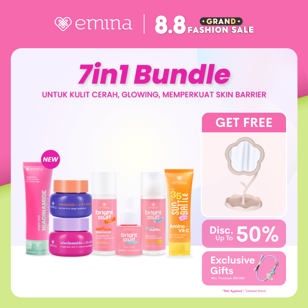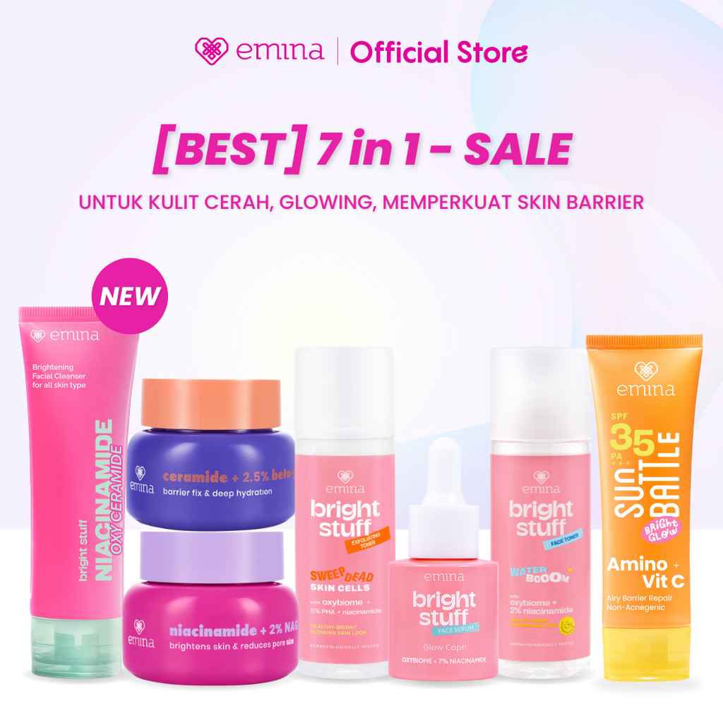 [BRIGHT GLOW SET] Emina Bundle All in 7in1 Face Wash + Exfo Toner + Toner + Serum + Moisturizer Gel + Brightening Sunscreen+ Low pH Micellar Water Bright & Smooth