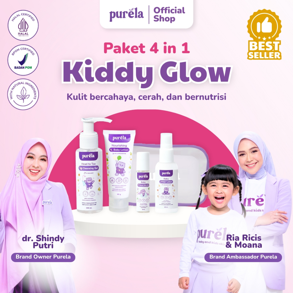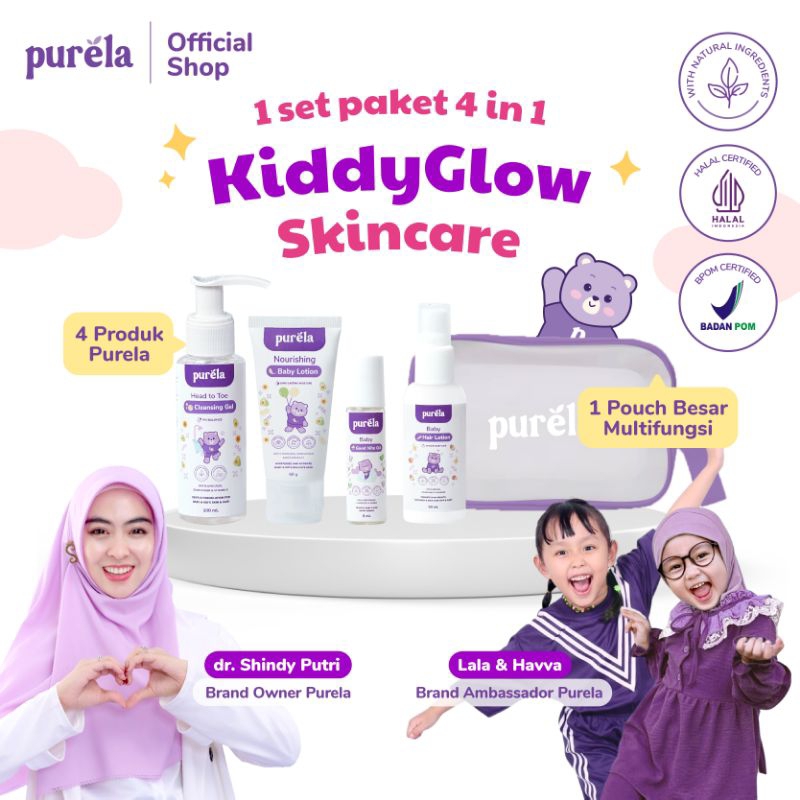 PURELA Paket 4in1 Kiddy Glow Skincare Free Pouch - Perawatan Pencerah Kulit Bayi Anak - Bahan Alami