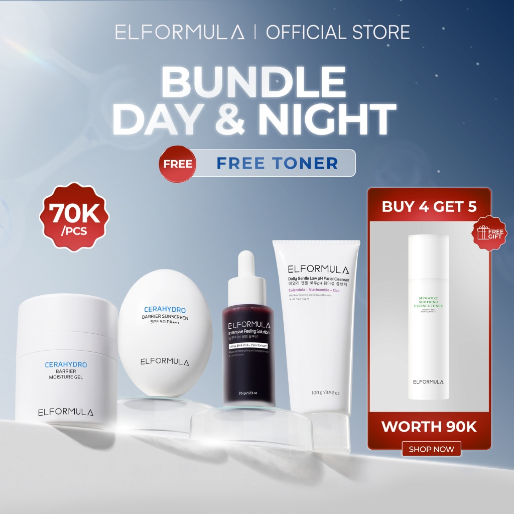 [ FREE TONER ] ELFORMULA Day & Night Bundle - Daily Gentle Low pH Facial Cleanser + CeraHydro Barrier Repair Moisture Gel + Intensive Peeling Solution + CeraHydro Barrier Repair Sunscreen SPF 50+++