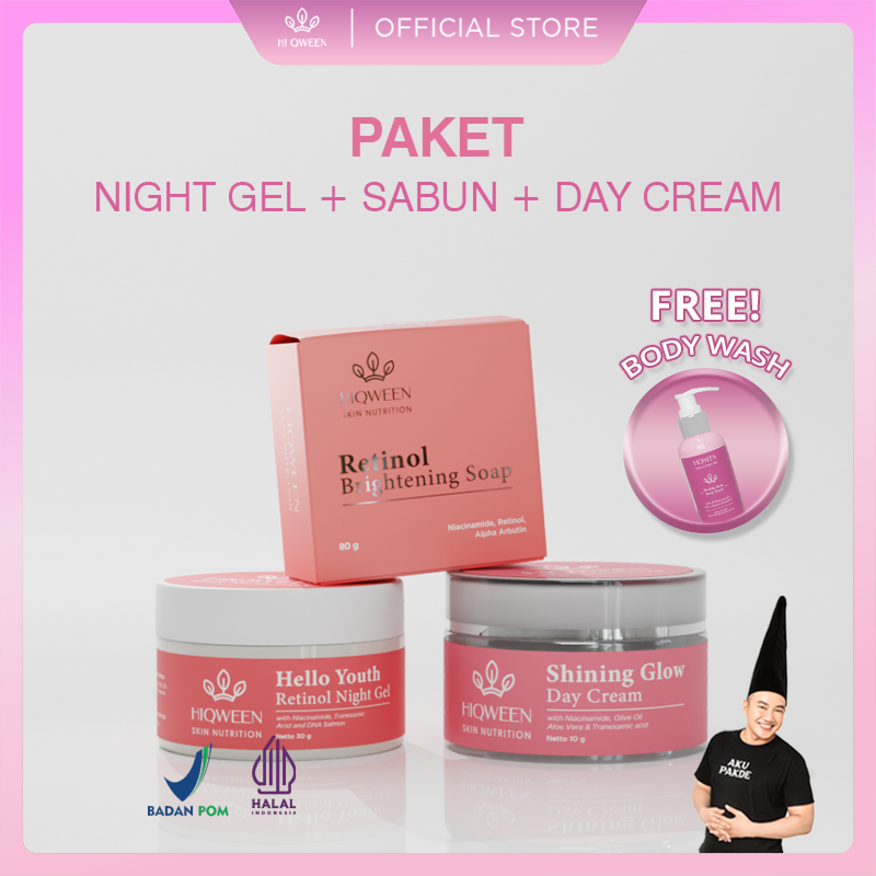 HIQWEEN PAKET KINCLONG ANTI FLEK SABUN + RETINOL NIGHT GEL + SHINING GLOW DAY CREAM Krim Siang Malam
