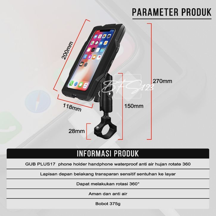 GUB PLUS17 Phone Holder Handphone Waterproof Anti Air Hujan Rotate 360