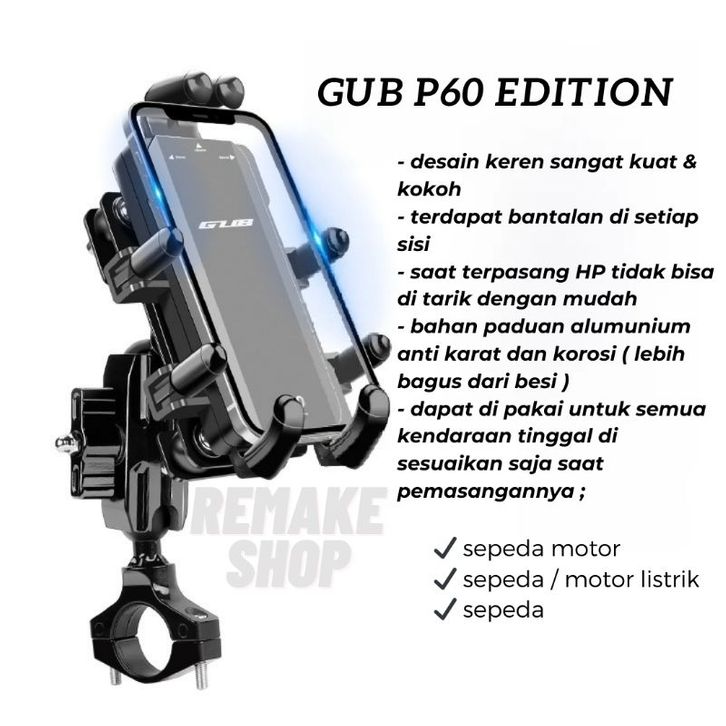 GUB P60 Phone Holder HP Motor GPS Full Besi Alumunium Alloy Anti Getar Guncangan Rotasi 360 Derajat Flexible di Stang S