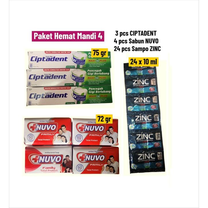 PAKET MANDI HEMAT 4 3 pcs PASTA GI CIPTADENT + 4 pcs SABUN BATANG NUVO + 1 RTG SHAMPO ZINC