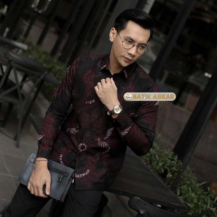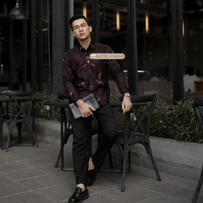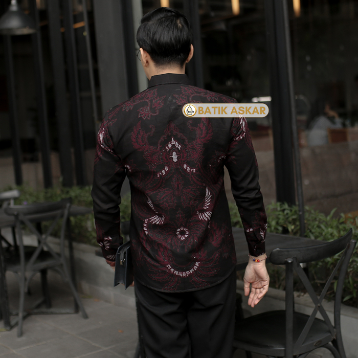 Askar Batik Motif Mahapatih Baju Kemeja Batik Pria Slimfit Lengan Panjang Elegant Modern Heem Premium Warna Hitam Merah