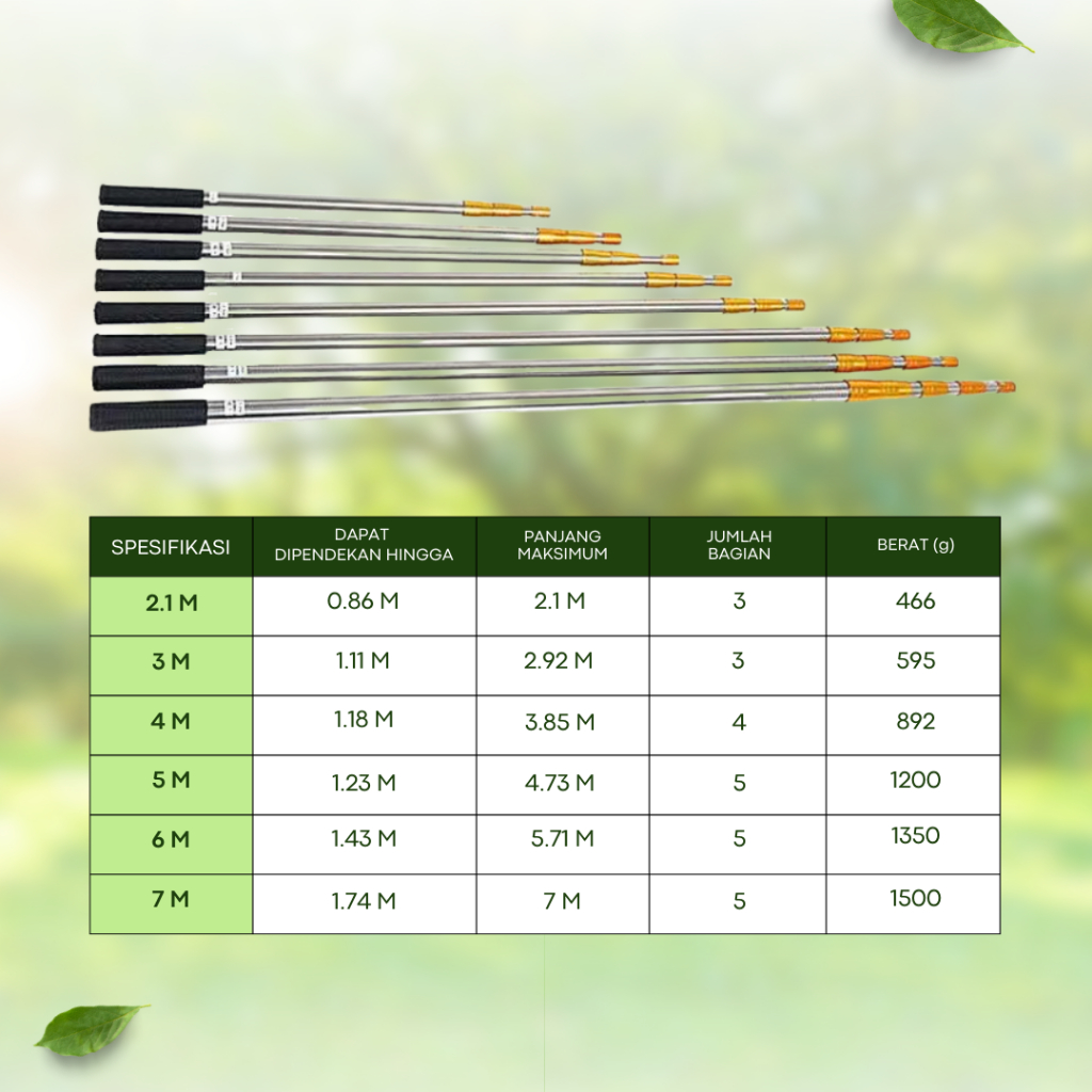 2.1 meter (tongkat), 3 meter (tongkat), 4 meter (tongkat), 5 meter (tongkat), 6 meter (tongkat), 7 meter (tongkat)