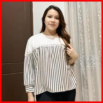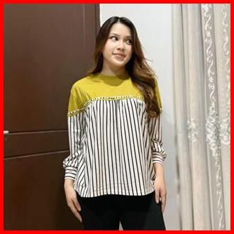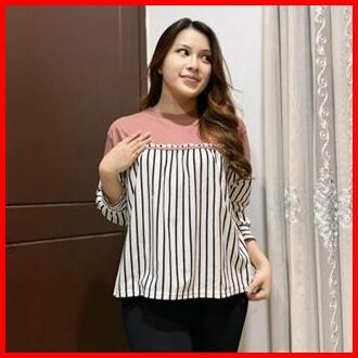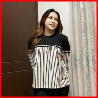 Zeeroks Baju Wanita Lengan Panjang Kominasi Salur Atasan Bahan Cotton Combed