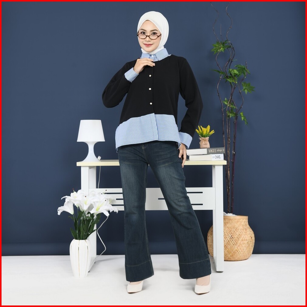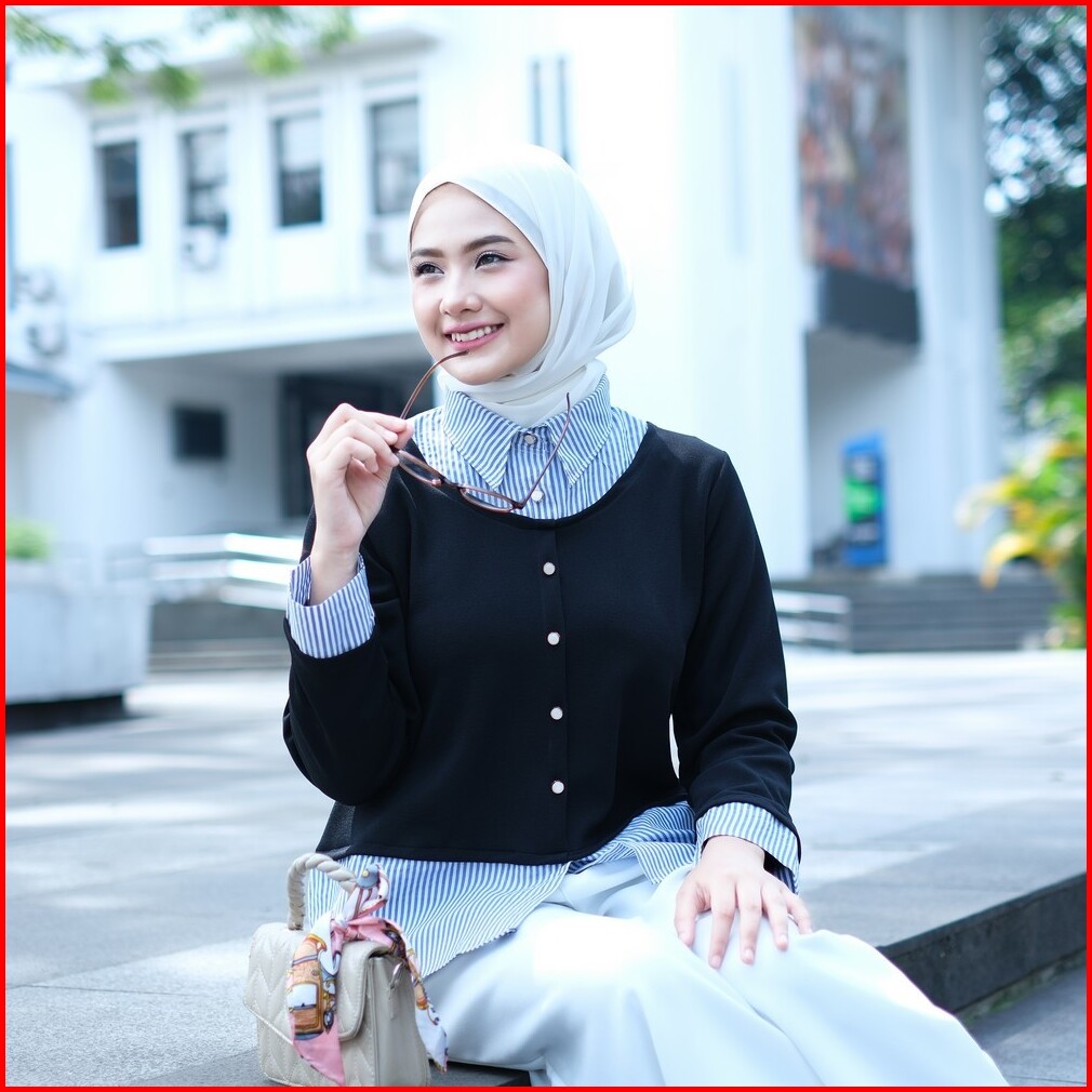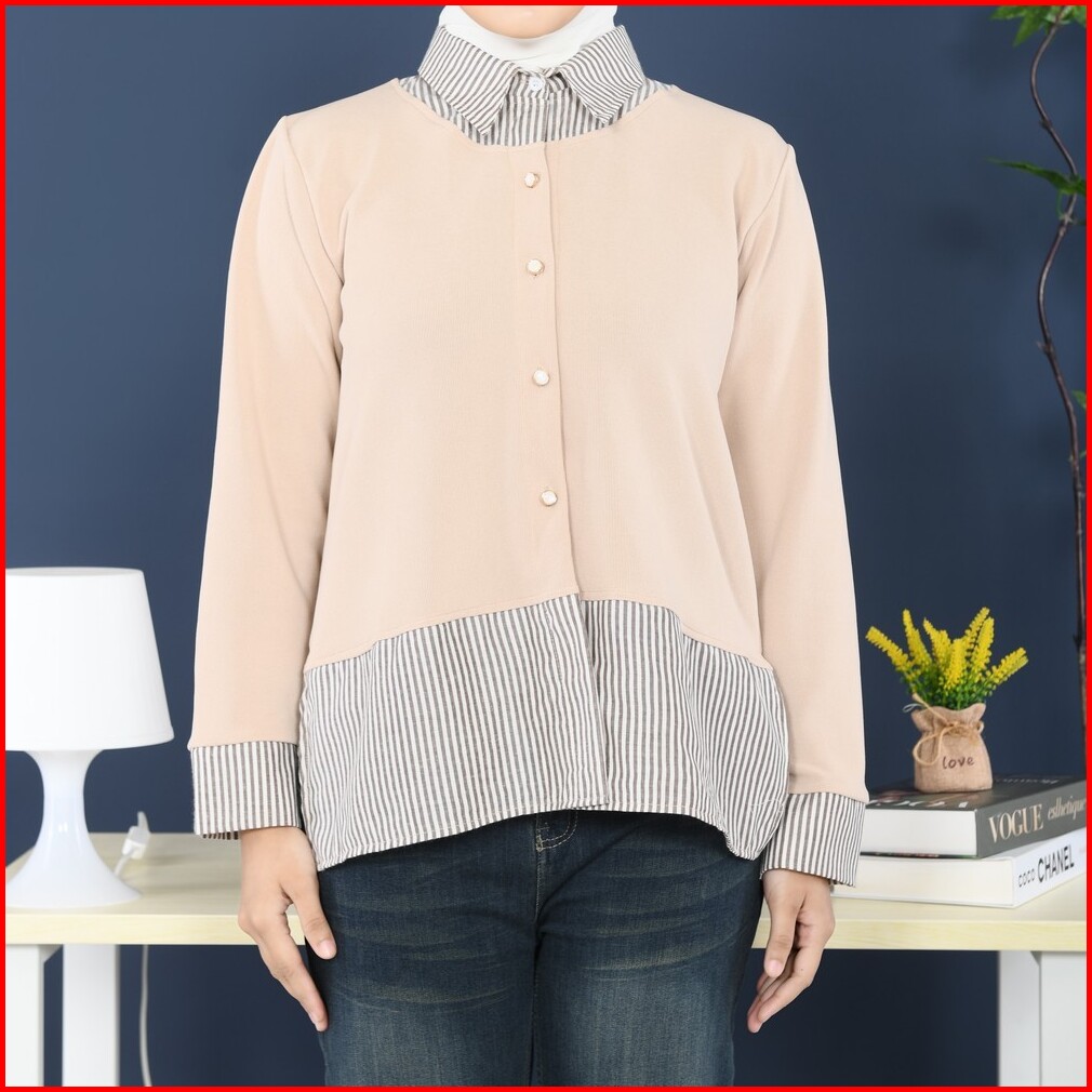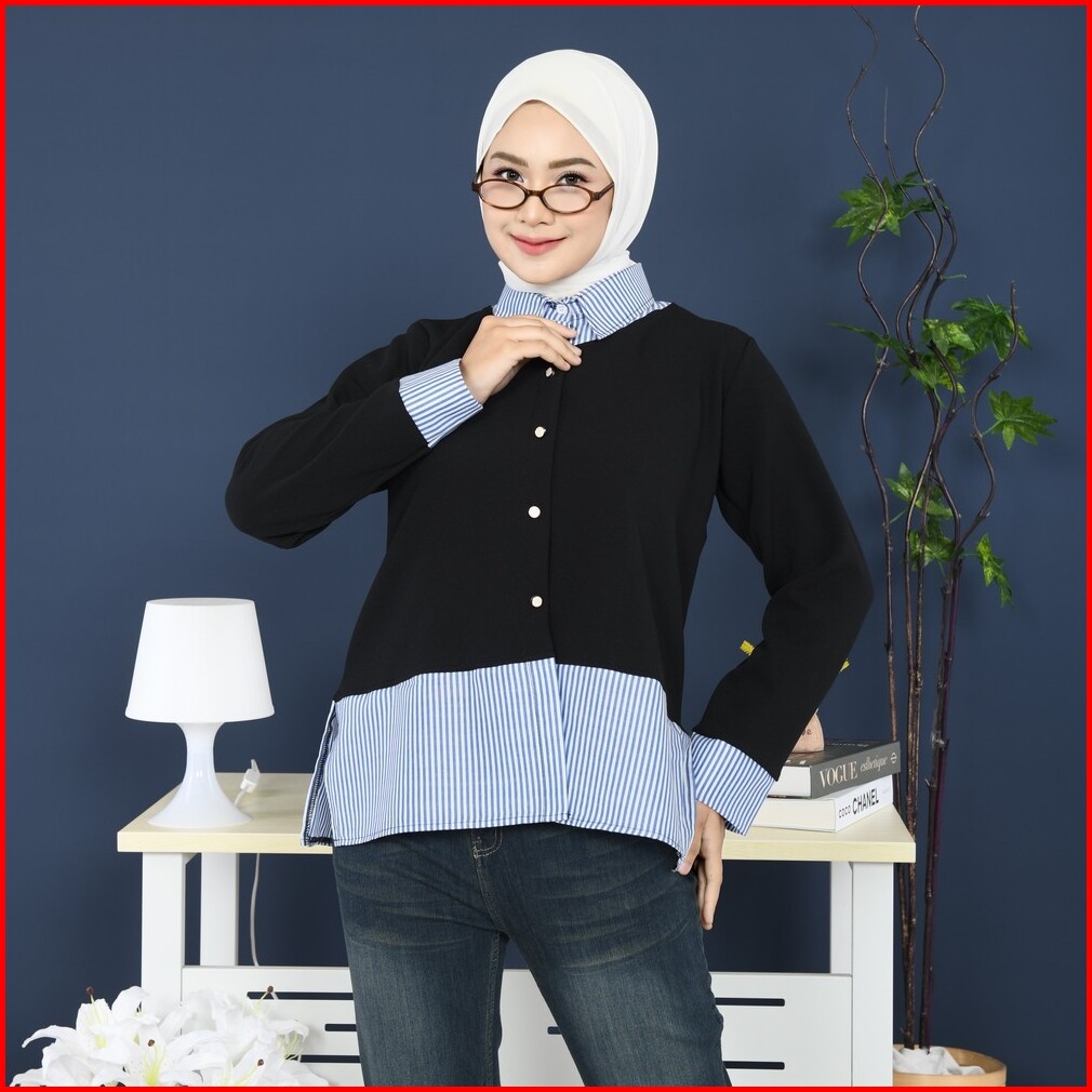 Mybamus X Listy Septia Ity Kemeja Layer Cardi Kombinasi Stripe Layer Shirt Atasan Wanita 2 In 1
