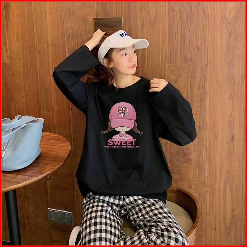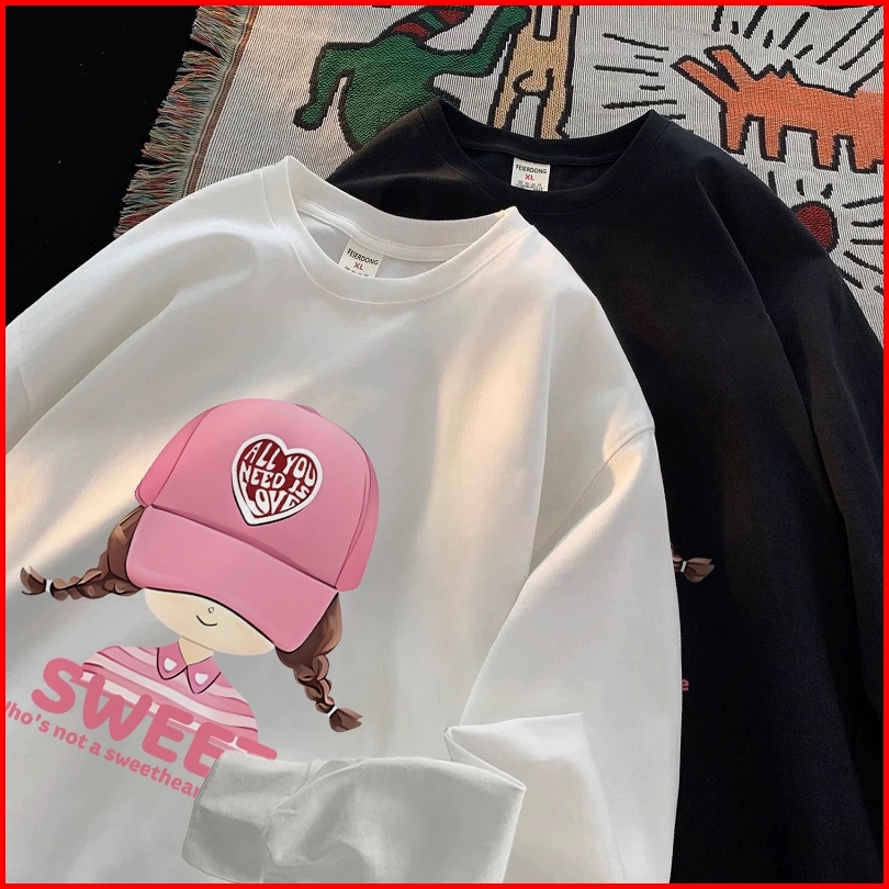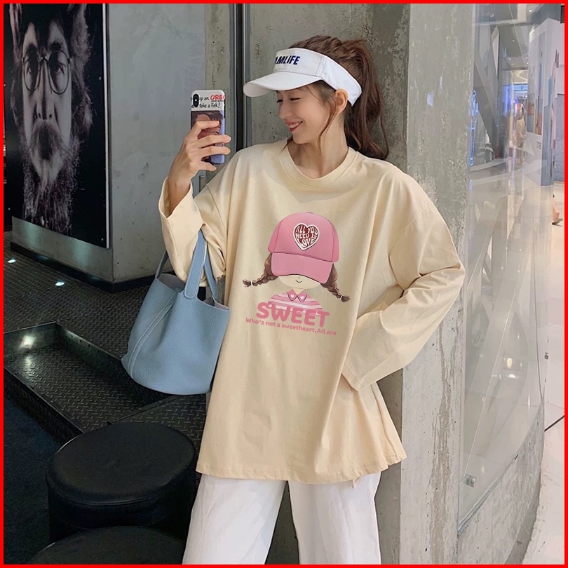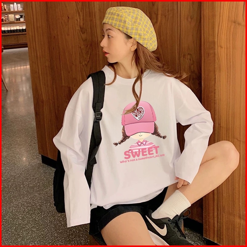 Forteid Atasan Kaos Wanita Oversize Lengan Panjang Korean Style Pola Cetak Gadis Topi Merah Muda Yang Lucu Baju Kaos Pol