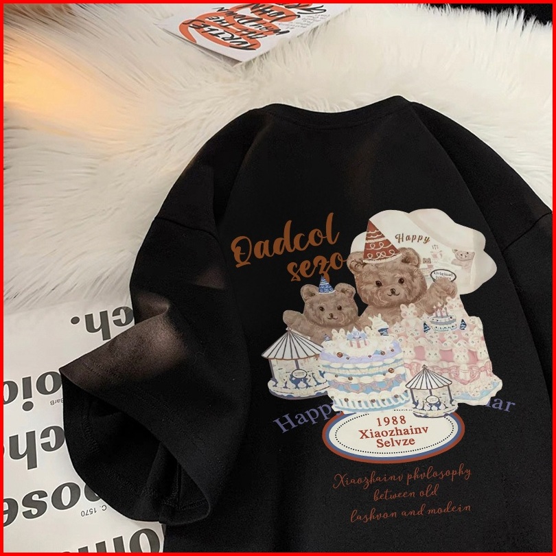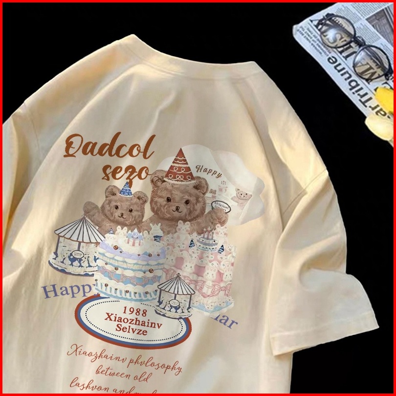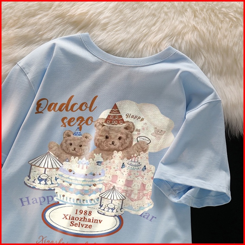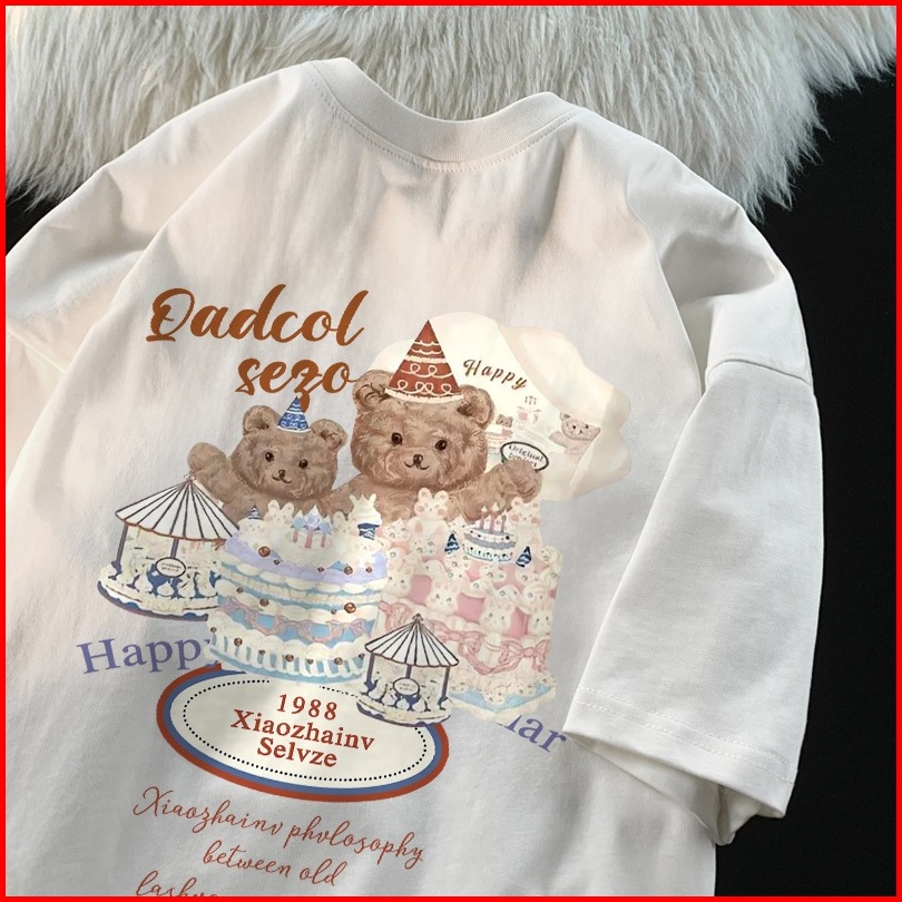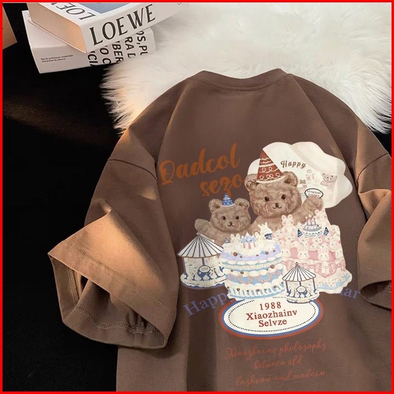 Forteid Baju Kaos Atasan Wanita Lengan Pendek Oversize Pola Pola Kue Beruang Kartun Lucu T-shirt Baju Atasan Lengan Pend
