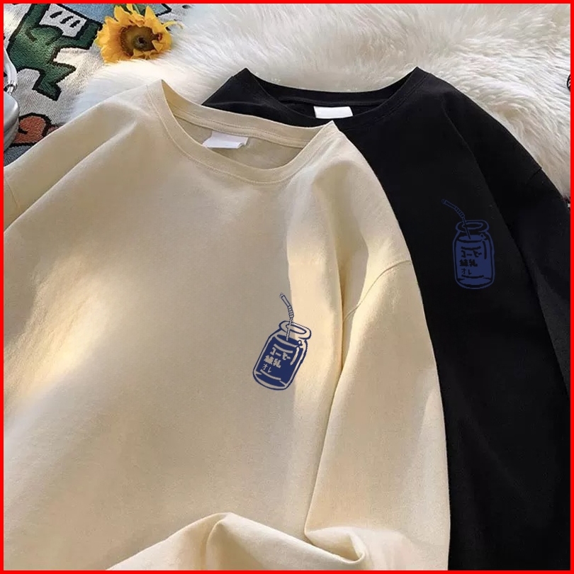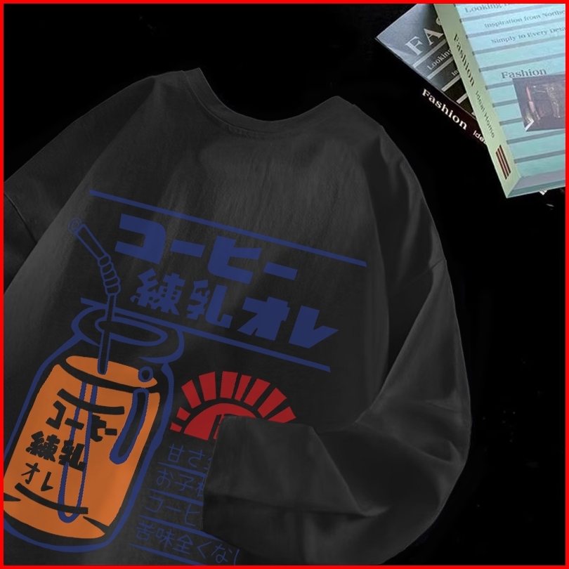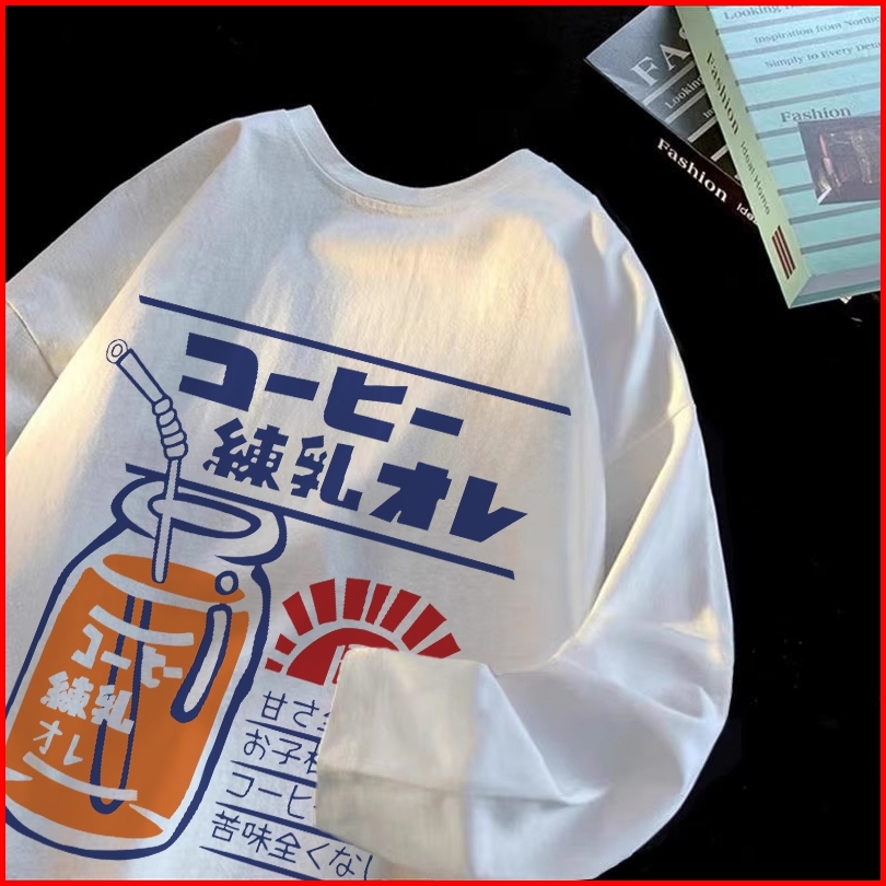 Forteid Atasan Kaos Wanita Oversize Lengan Panjang Korean Style Cetak Pola Minuman Jepang Baju Kaos Polos Cotton Combed