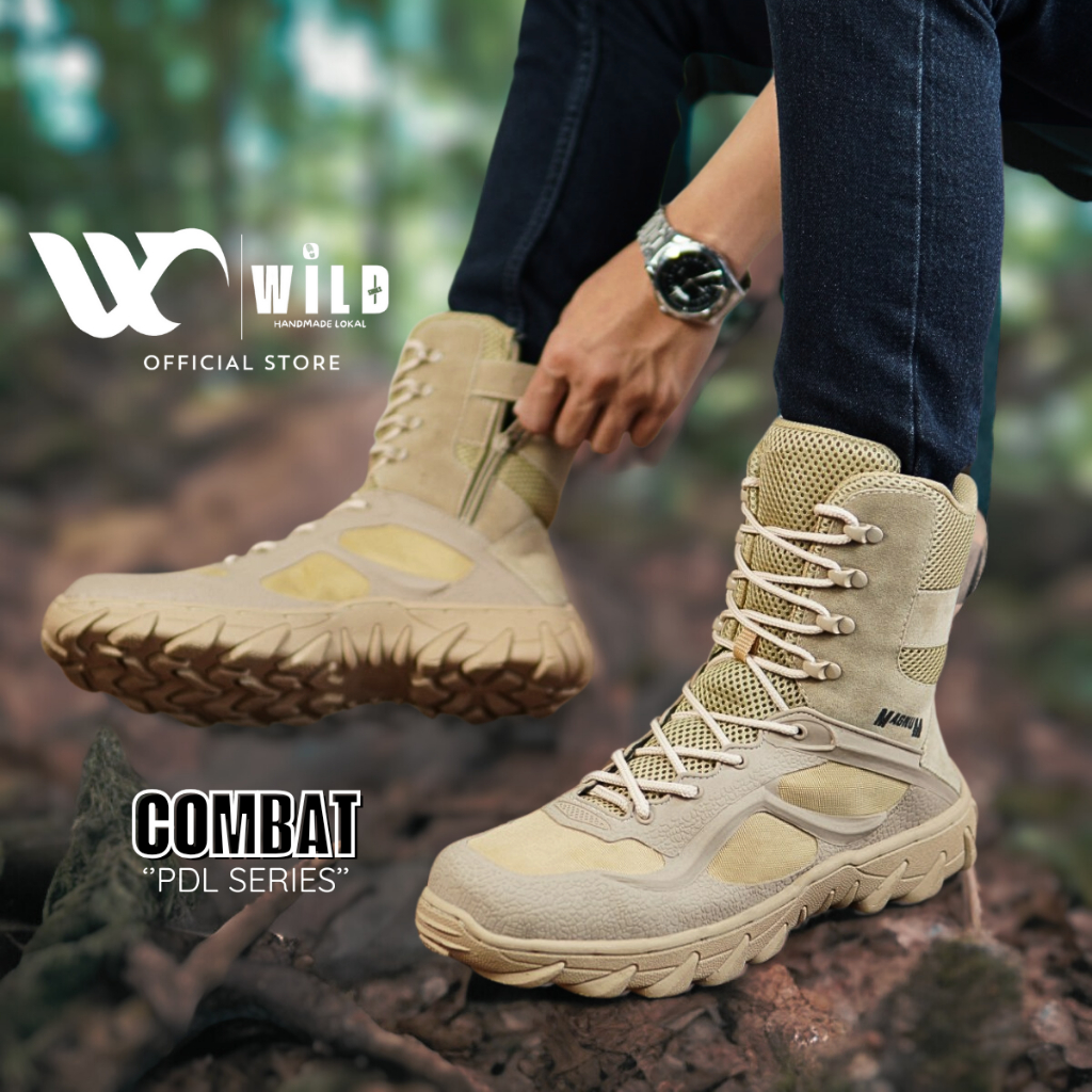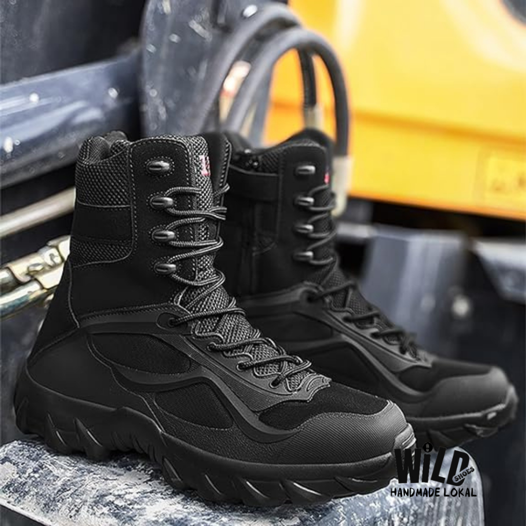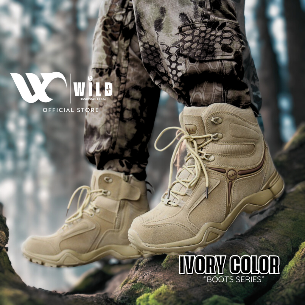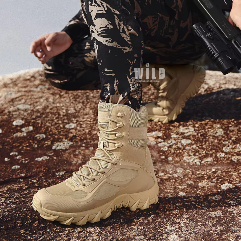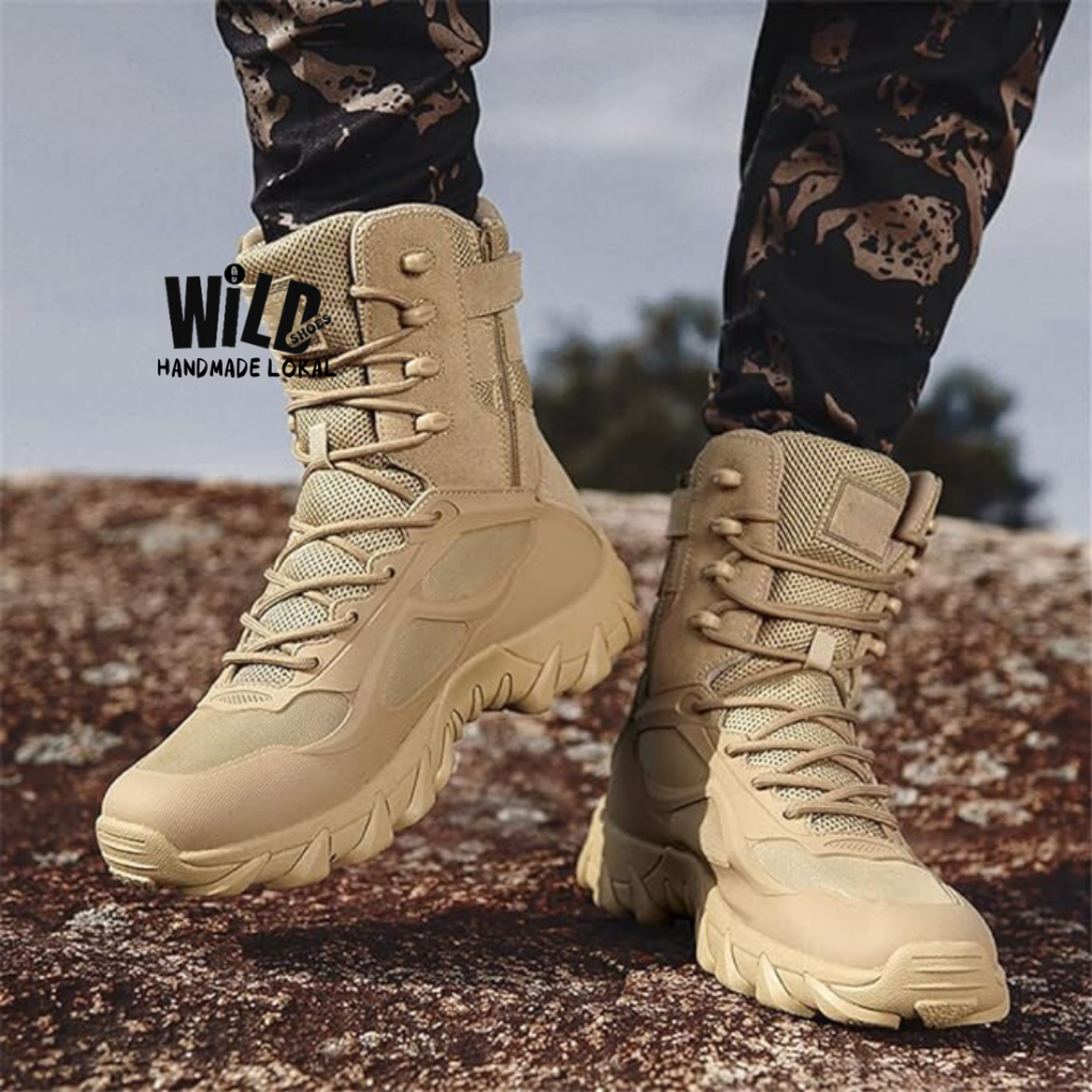 Sepatu Safety Pria High Best Quality - Sepatu Tactical Hitam Krem - Sepatu Boot Outdoor Tracking - WILDSHOES