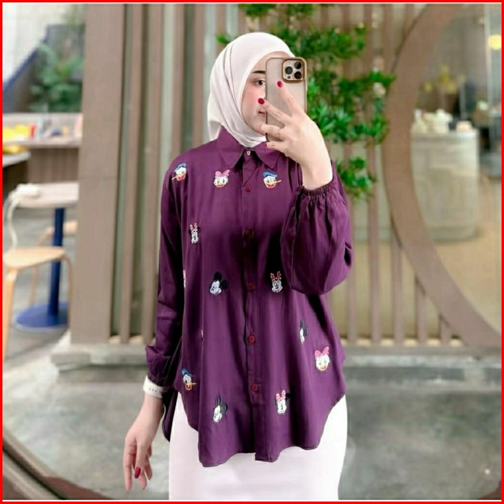 Kemeja Mickey Atasan Wanita Bordir Lucu Rayon Twill Polos Premium