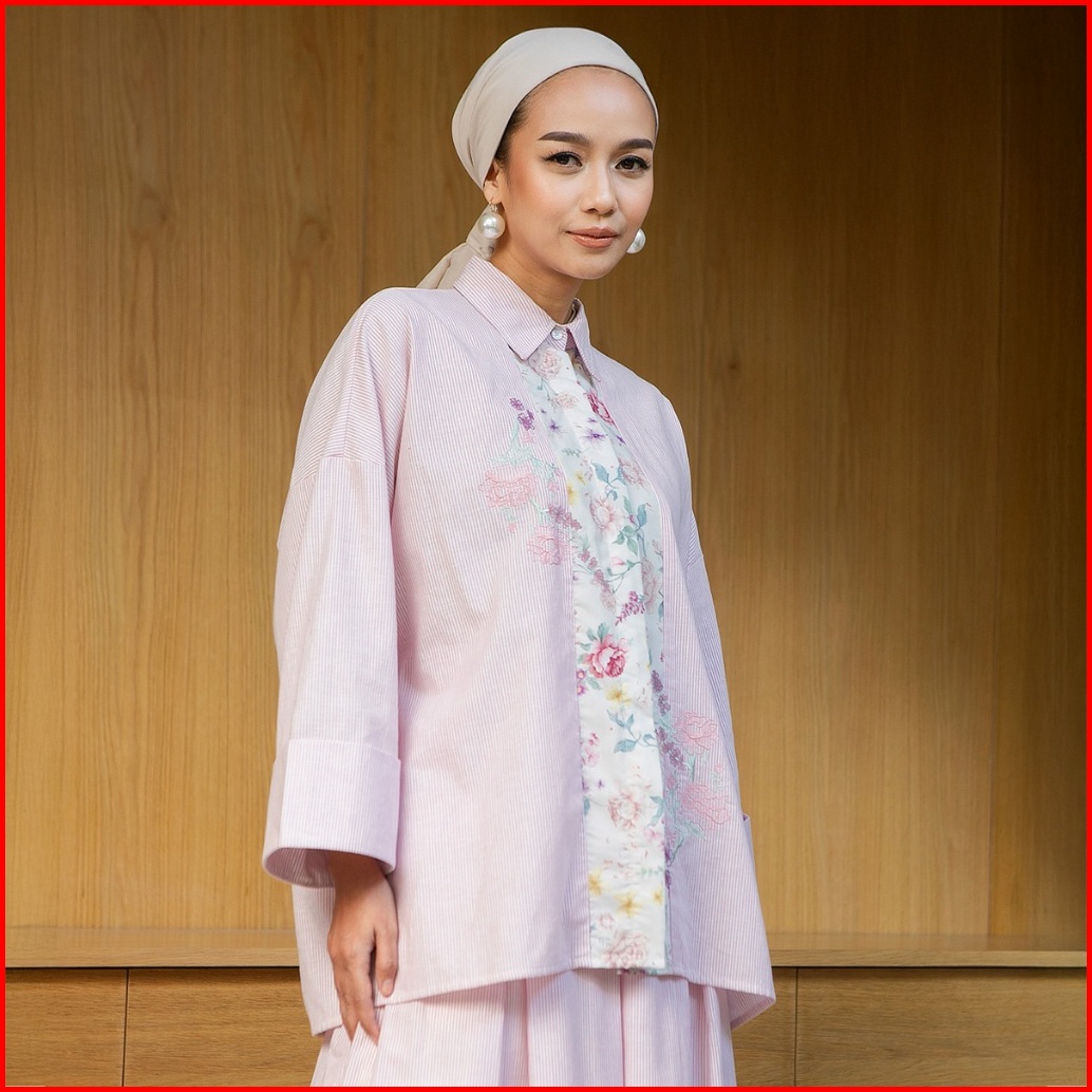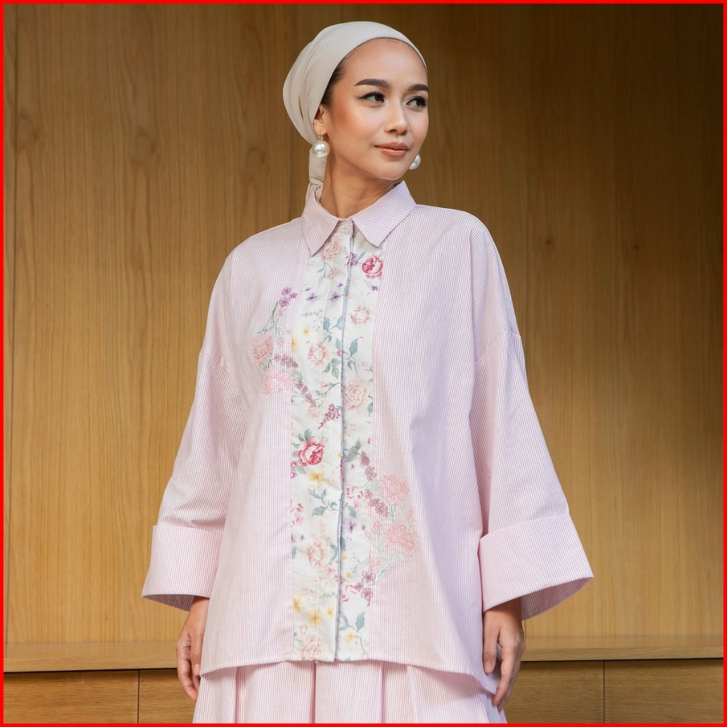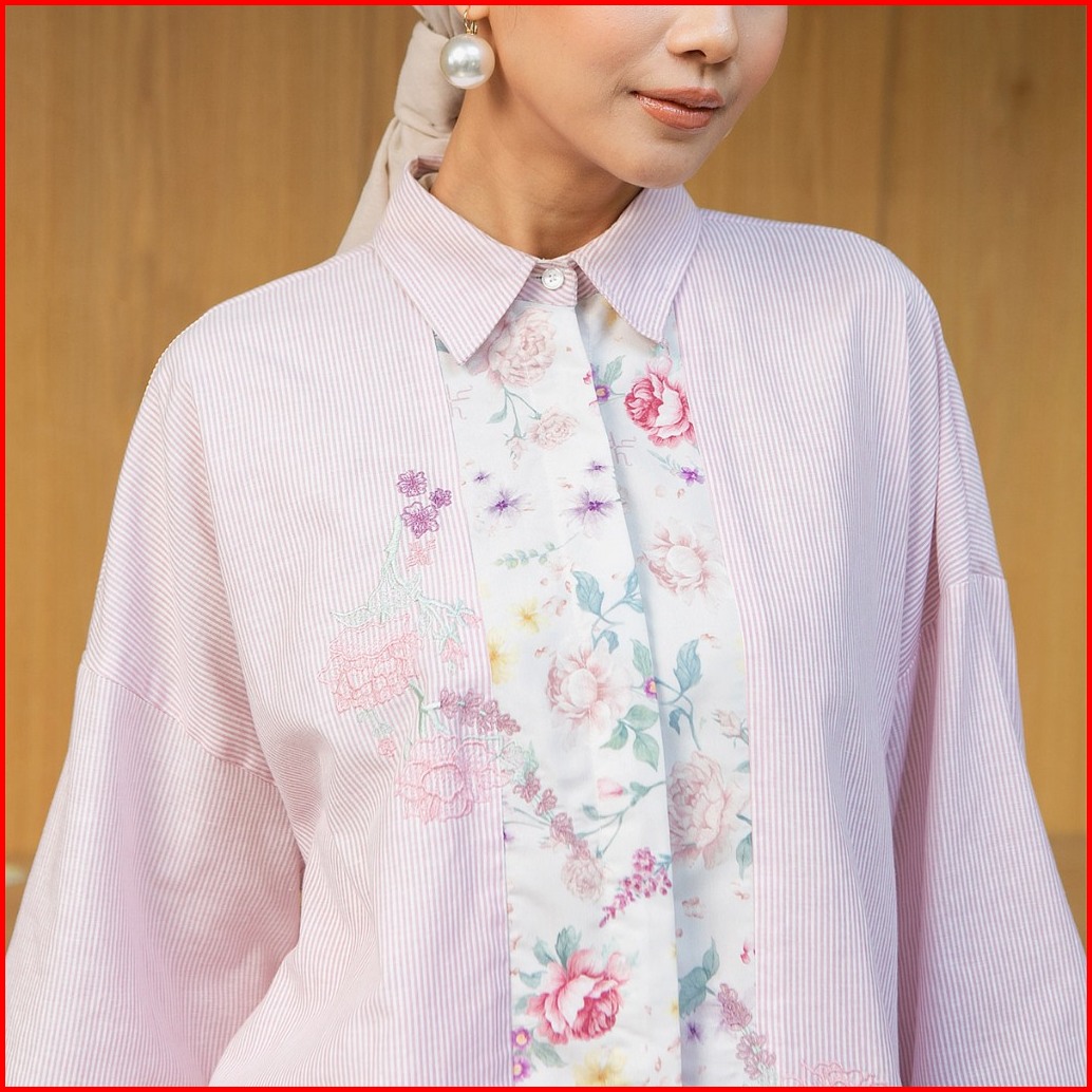 Hijabchic Rhett Pale Pink Top - Kemeja Stripe Oversized Katun Premium Motif Bunga Mewah