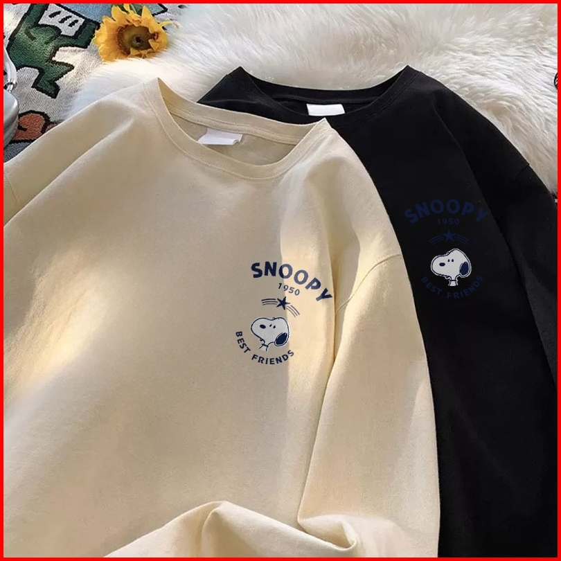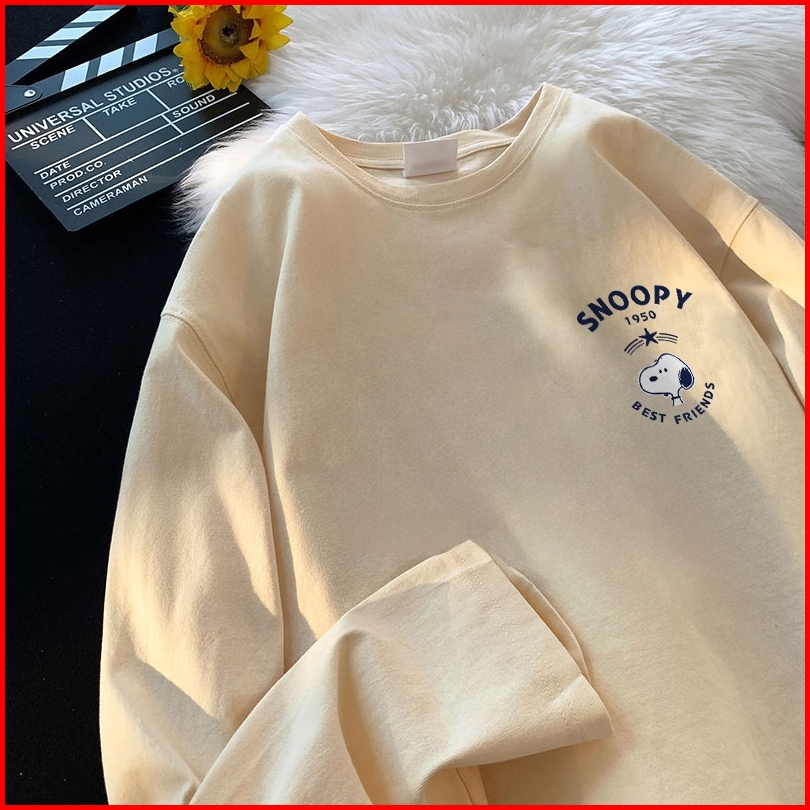 Forteid Atasan Kaos Wanita Oversize Lengan Panjang Korean Style Pola Kecil Anjing Snoopy Kartun Baju Kaos Polos Cotton C