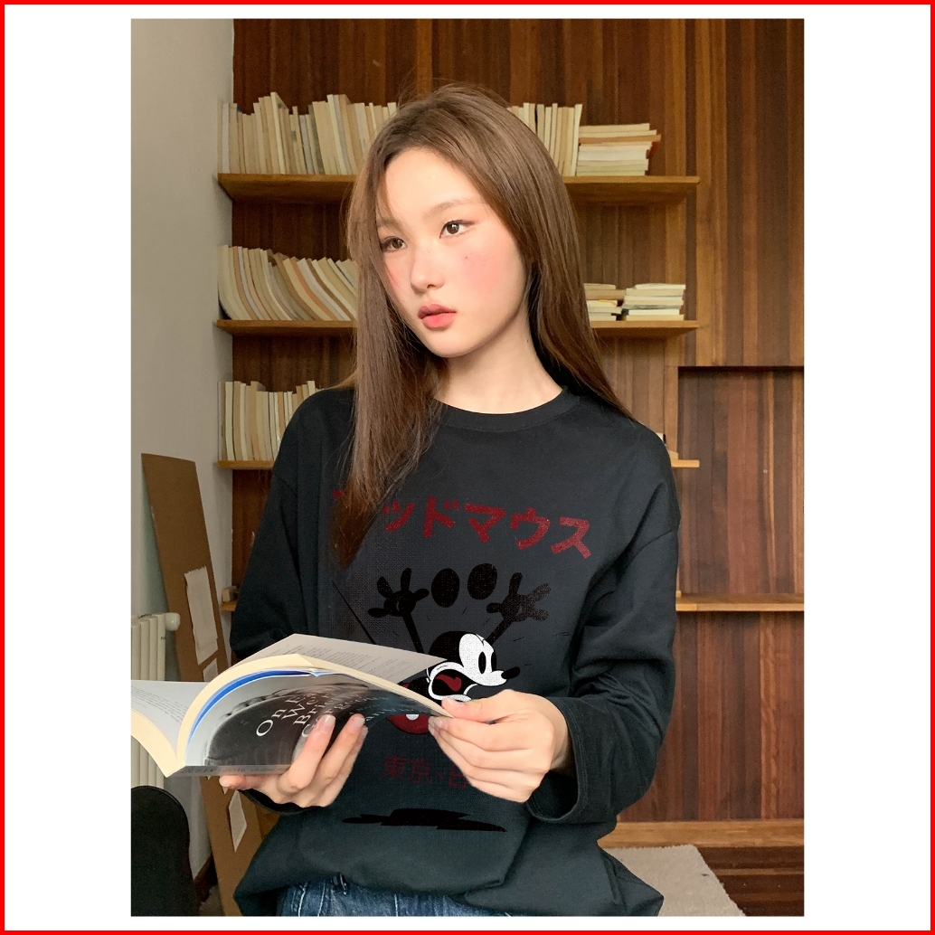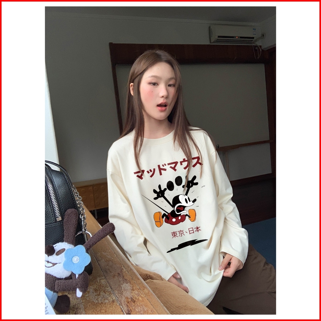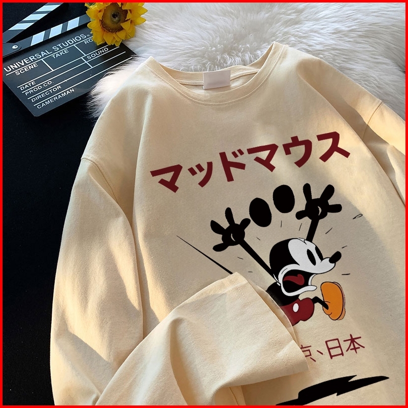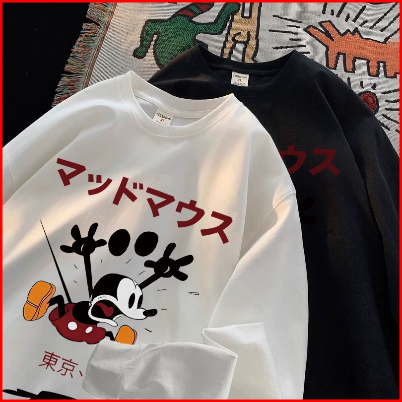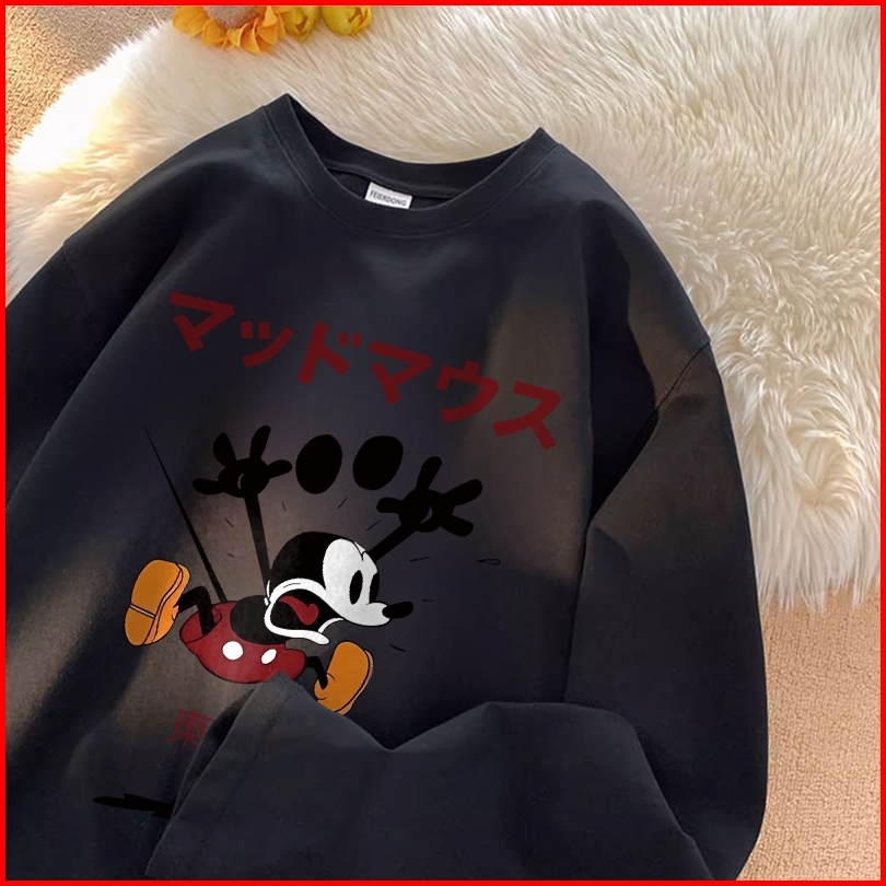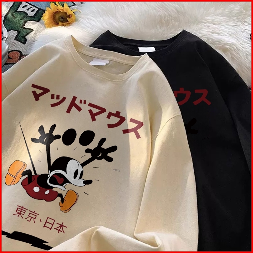 Forteid Atasan Kaos Wanita Oversize Lengan Panjang Korean Style Pola Mickey Mouse Yang Lucu Dan Gila Baju Kaos Polos Cot