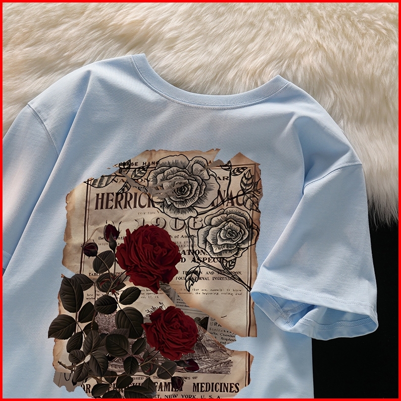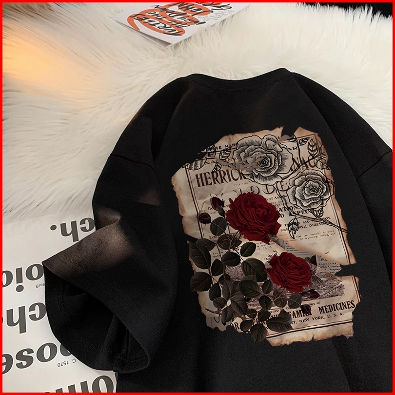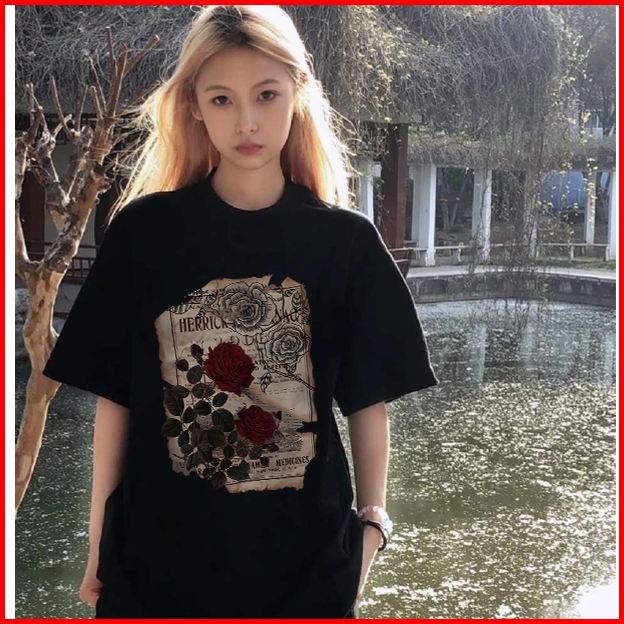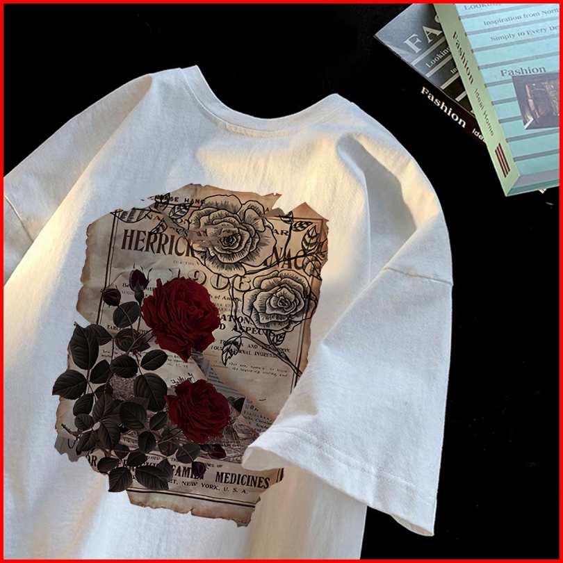 Forteid I0175cetakan Mawar Antik Tshirt Kekinian Korean Style Kaos Oversize Wanita 100 Cotton