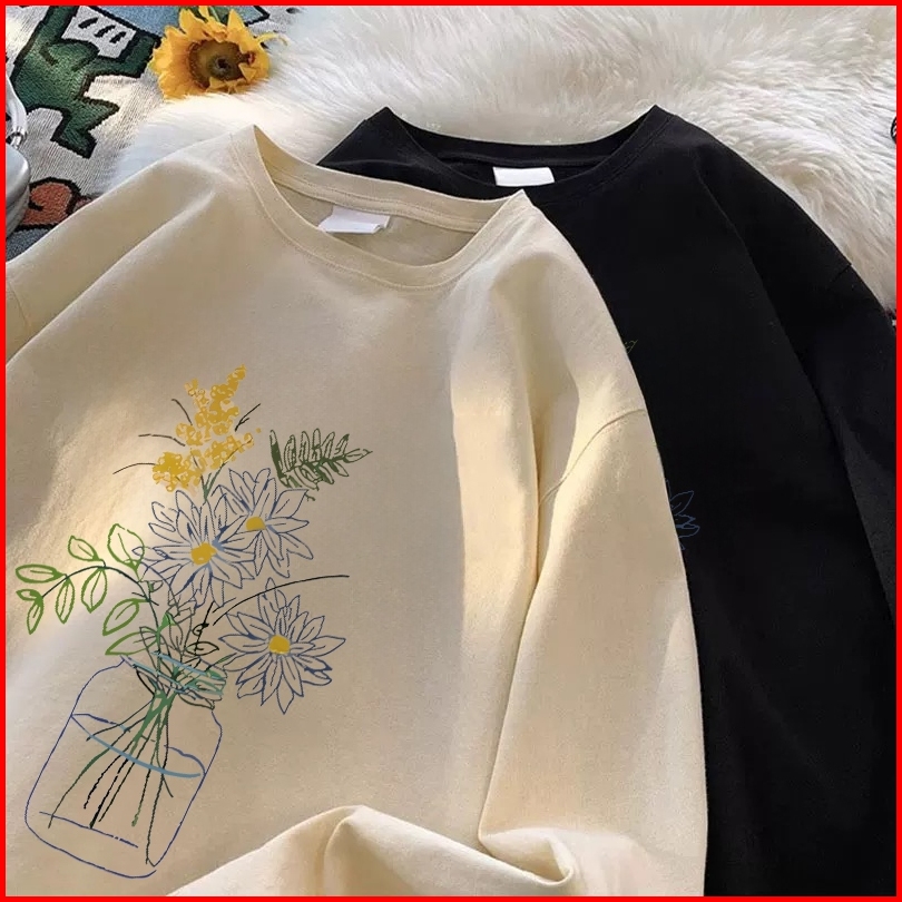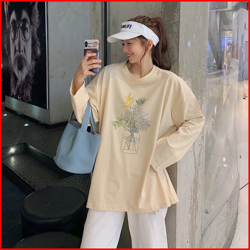 Forteid Atasan Kaos Wanita Oversize Lengan Panjang Korean Style Putih Bunga Hijau Baju Kaos Polos Cotton Combed Premium