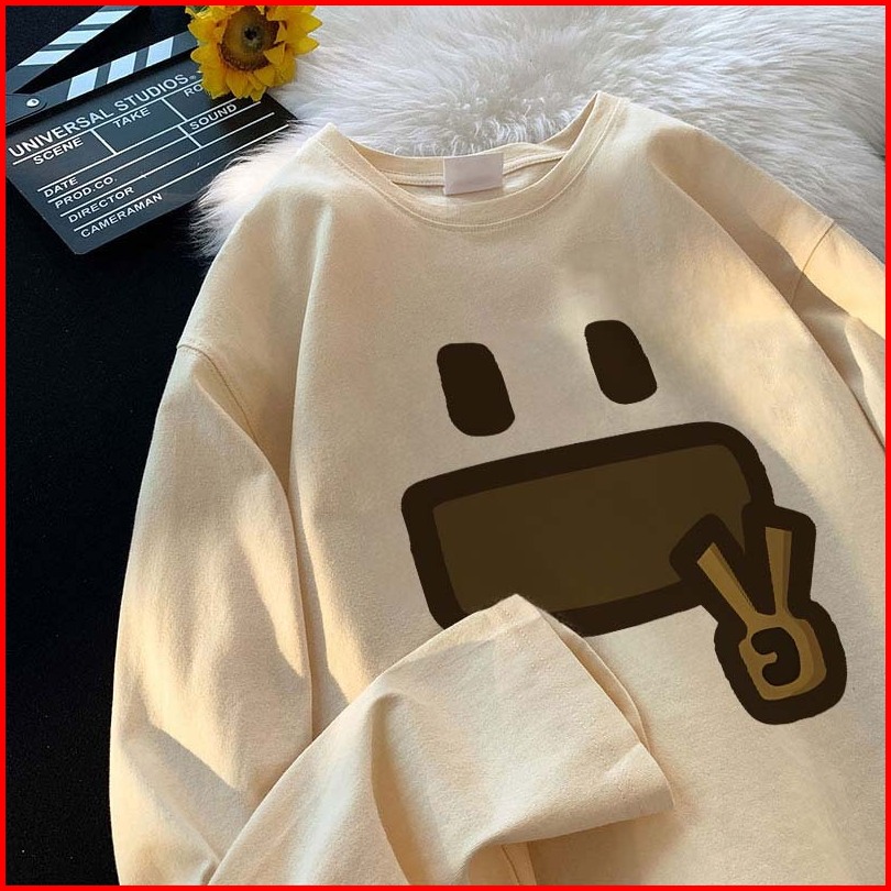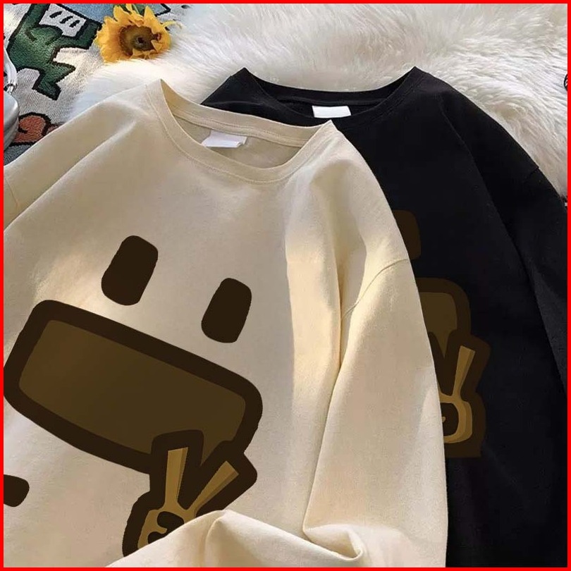 Forteid Atasan Kaos Wanita Oversize Lengan Panjang Korean Style Cetakan Wajah Tersenyum Yang Lucu Dan Menggemaskan Baju